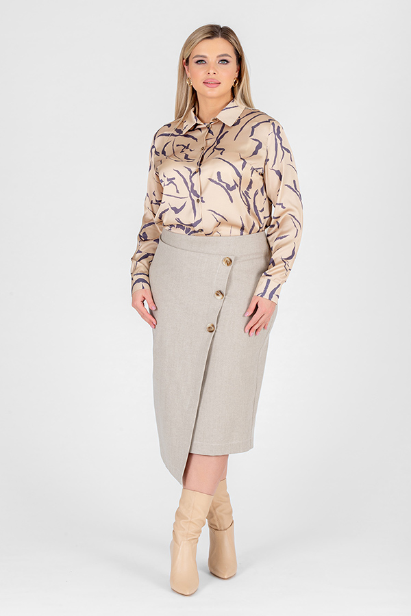 Юбка прямого силуэта из костюмной ткани с узором в «ёлочку». Изделие с запахом, зафиксированным в области талии и декоративными пуговицами. Сзади по среднему шву застёжка-молния. Изделие без пояса, верхний срез обработан обтачкой.