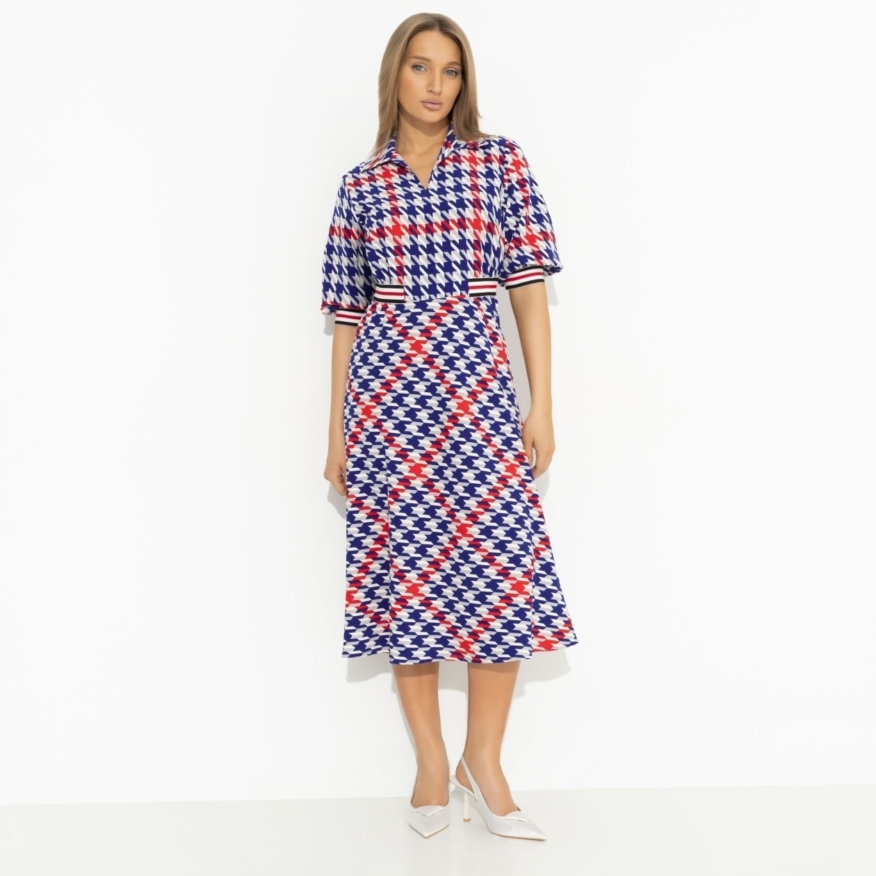 Гусиная лапка вышла на новый модный уровень. Из монохромного орнамента она превратилась в яркий принт благодаря дизайнерам CHARUTTI. Теперь платье будет видно издалека. Платье приталенного силуэта в длине миди. Акцент из контрастной резинки на талии и на рукавах изделия. Ворот в стиле поло.