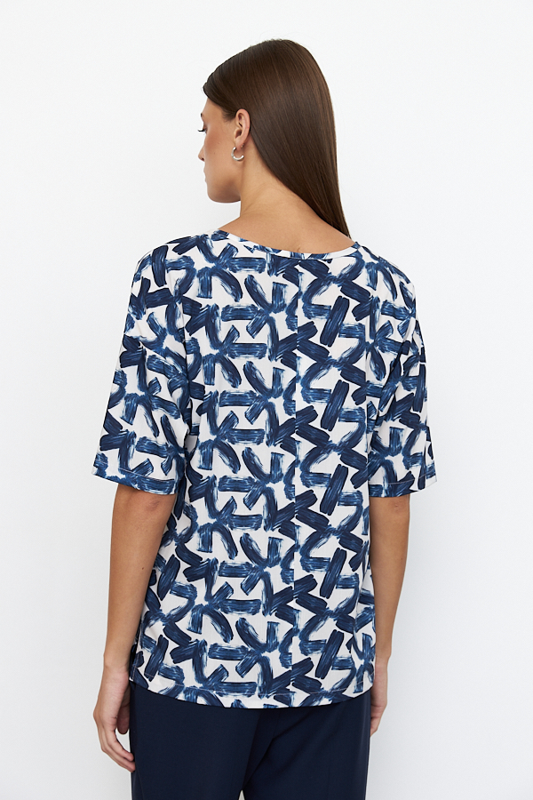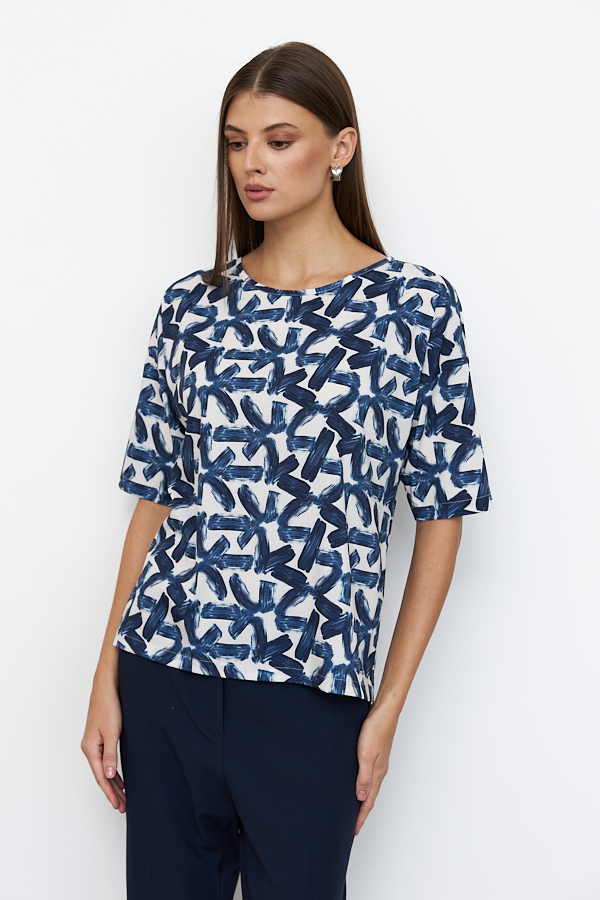 Блуза свободного силуэта из блузочной ткани. Низ изделия асимметричной длины (спинка удлинена относительно переда) с разрезами в боковых швах. Втачной рукав в спущенную пройму. Круглый вырез горловины оформлен косой бейкой из основной ткани.