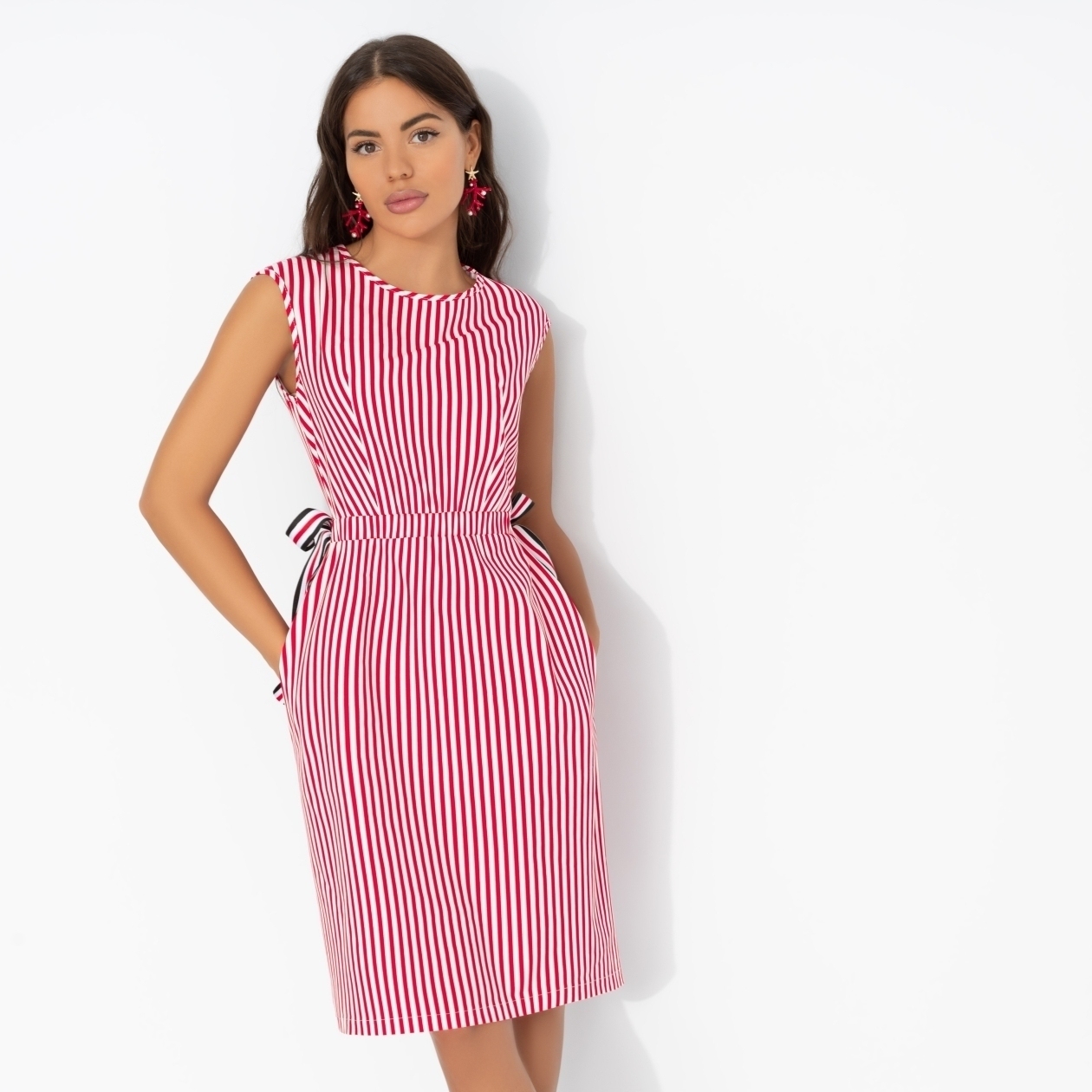Не платье ЧАРУТТИ, а карта твоих приключений в отпуске. Красными линиями отмечены границы веселого времяпрепровождения, белыми – романтика. Такое чередование нам подходит. Платье трапециевидного силуэта в длине выше колена. Акцент на талии – вшитая резинка, оформленная завязками по бокам изделия. Платье без рукавов.