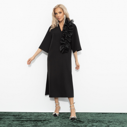 Она выходит из машины – и мгновенно притягивает взгляды. Свет прожекторов скользит по ткани. В этом платье можно смело притягивать все внимание публики. Платье прямого силуэта, с аккуратным вырезом и укороченными рукавами. Минималистичный крой подчёркивает осанку и уверенность. Идеальный выбор для эффектных появлений. Платье прямого силуэта с разрезом. Объемный декор из органзы съемный.