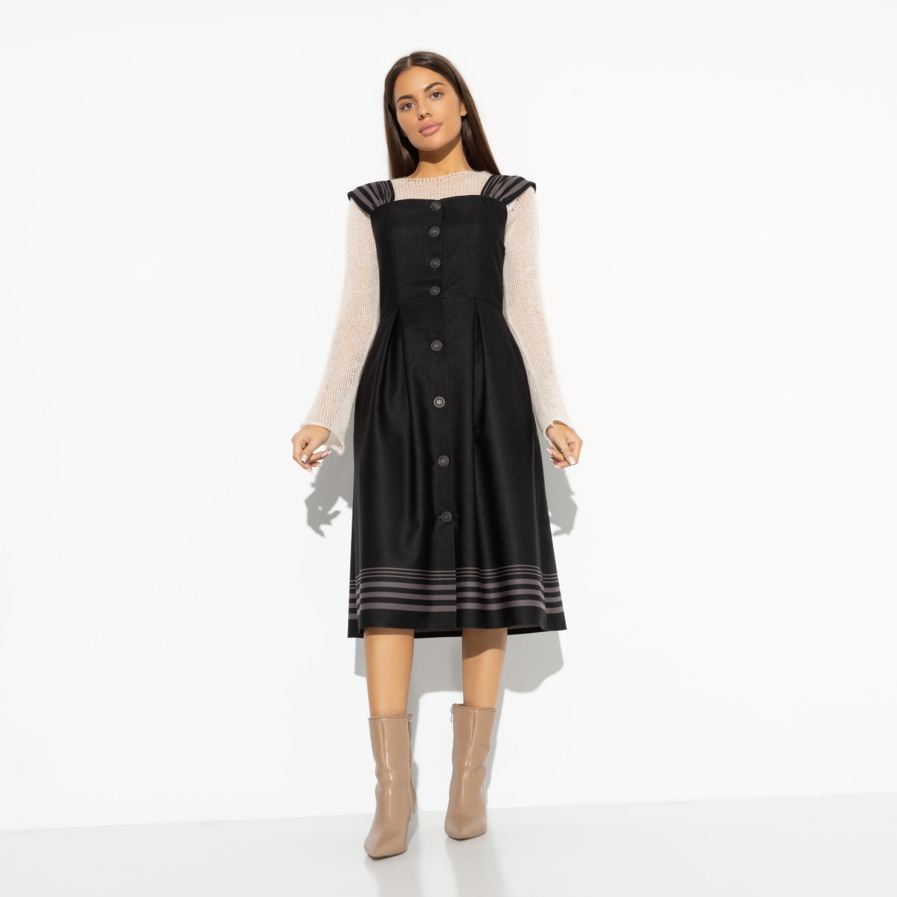 Он часто называл тебя принцессой, в конце концов, ты ею и стала. Сдержанность, элегантность и высокое внутреннее достоинство воплотились в сарафане CHARUTTI. Сарафан в длине миди. Приталенный силуэт, расклешенный фасон юбки. Широкие бретели. Сарафан застегивается на пуговицы по всей длине изделия.