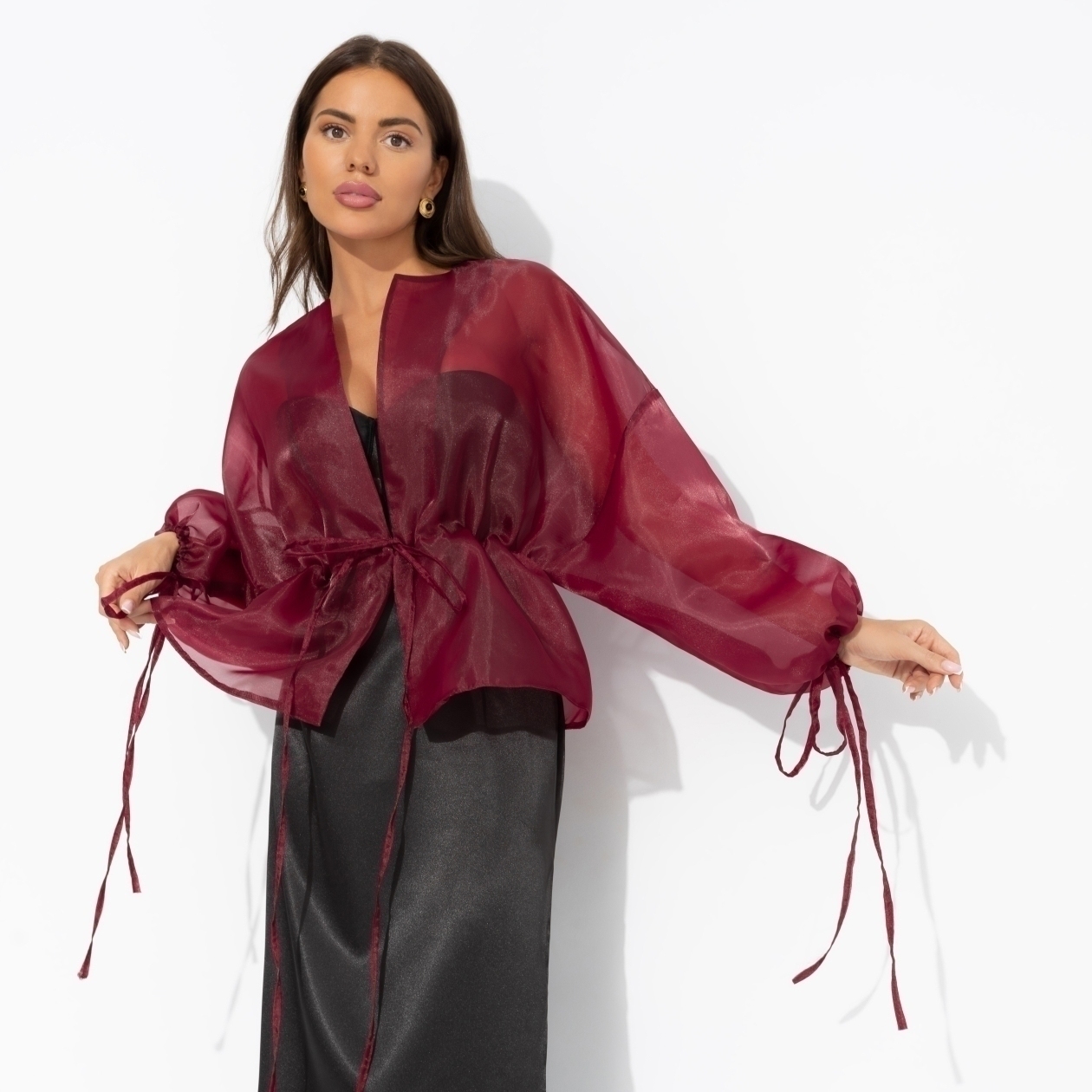 Ты зашла в бар и заказала бокал Бордо. Хотела насладиться приятным одиночеством. Но в жакете ЧАРУТТИ сделать это не удалось. Каждая вторая женщина хотела узнать, откуда жакет, каждый первый мужчина хотел познакомиться. Ни минуты покоя. Жакет свободной посадки на кулиске. Линия плеча спущена. Рукава дополнены тонкими завязками. Изделие просвечивает.