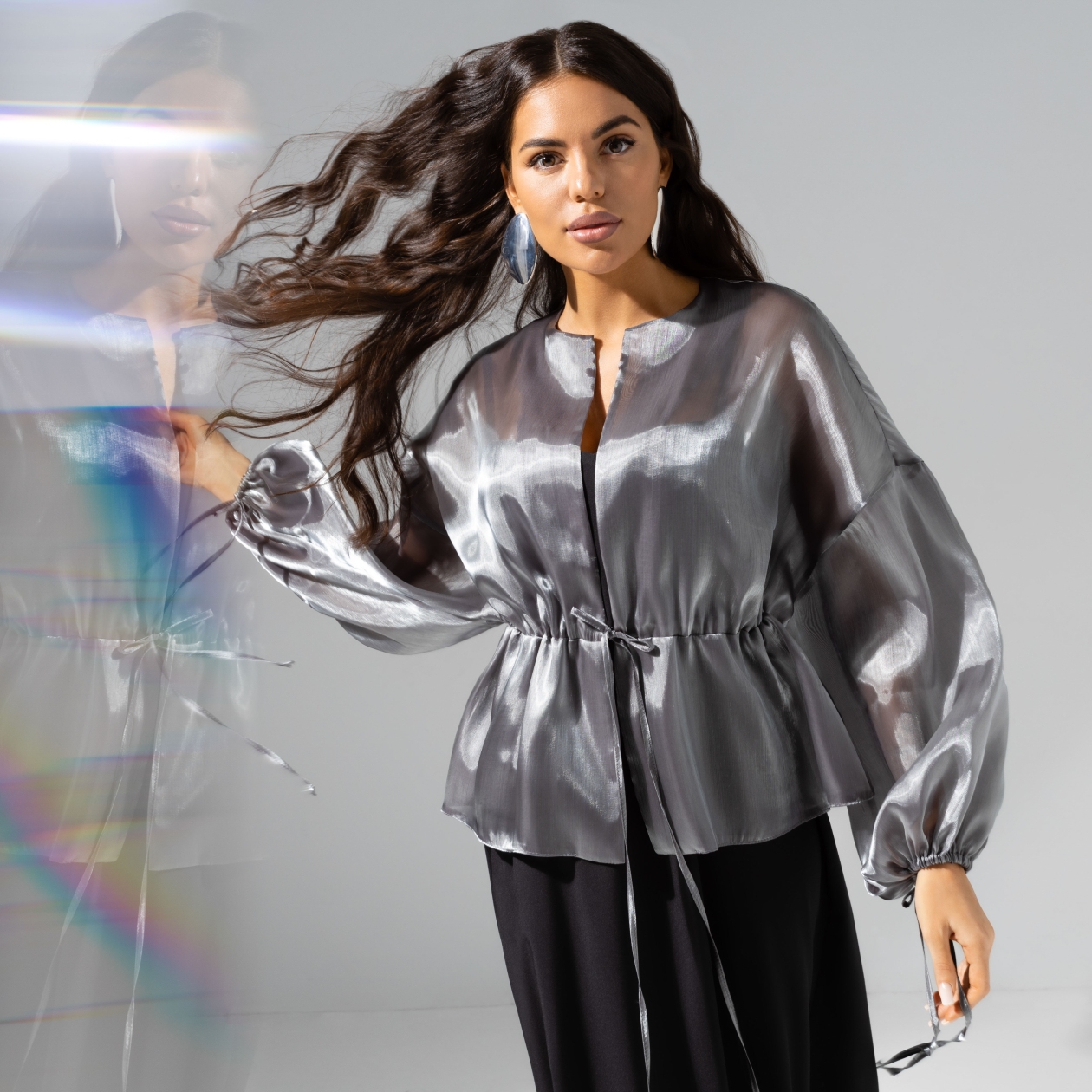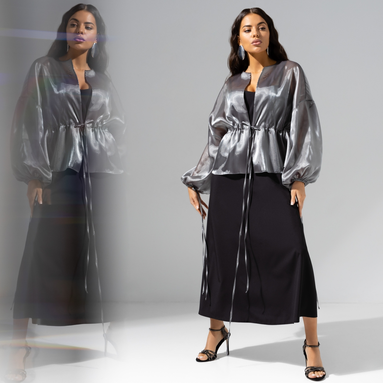 Если бы мир вдруг стал черно-белым, ты по-прежнему была бы в нем великолепна. Жакет CHARUTTI из органзы в цвете серебристый шик сделает тебя звездой в любых цветовых измерениях. Жакет из полупрозрачной органзы на завязках. Спущенная линия рукава. Рукава объемные, обрамлены длинными завязками по манжету в тон изделия.