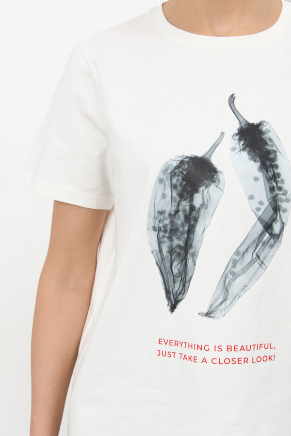 Джемпер свободного силуэта из хлопкового эластичного полотна. Втачной короткий рукав. Круглый вырез горловины оформлен бейкой.