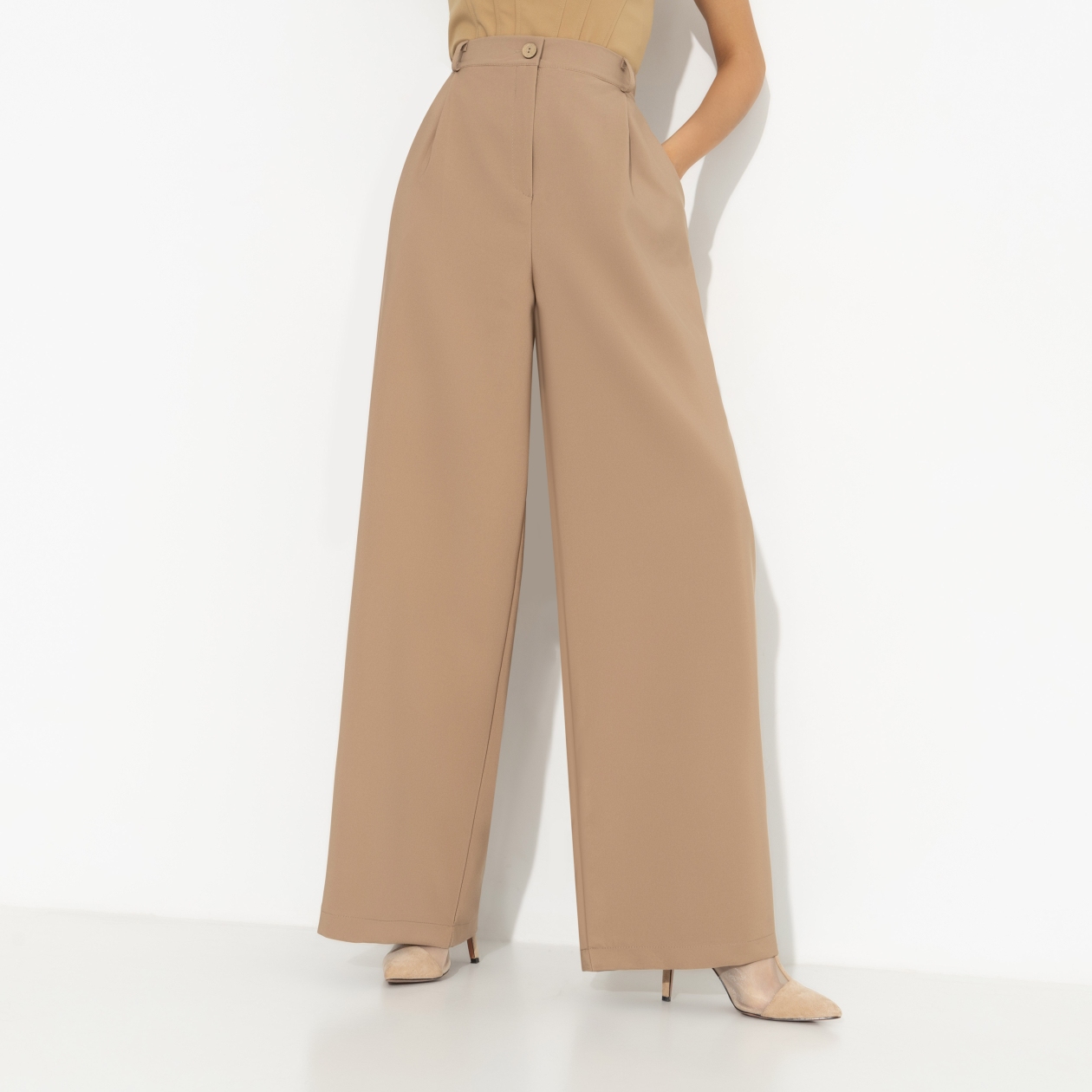Традиционное итальянское печенье Кантуччи можно легко приготовить в домашних условиях. Но зачем? Лучше надеть брюки CHARUTTI в цвете песочного теста и отправиться в итальянскую кондитерскую. И посуду мыть не придется. Брюки широкие. Высокая посадка на талии. Изделие застегивается на молнию и пуговицу. Пояс дополнен резинкой для лучшего прилегания. Есть шлевки. Брюки с карманами.