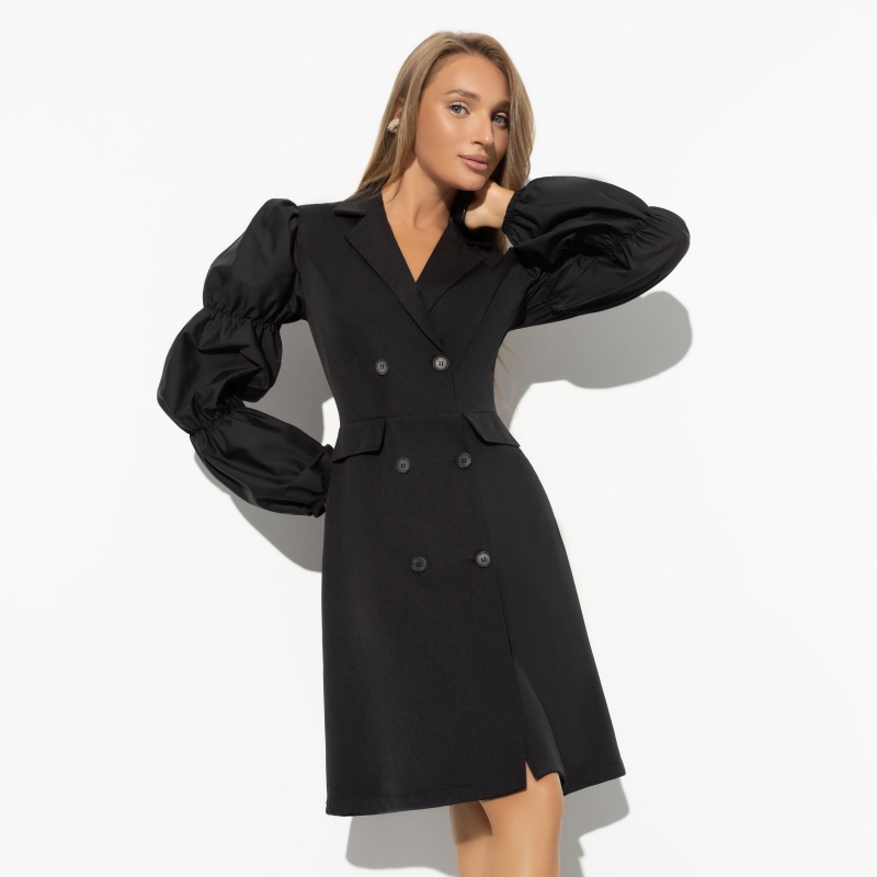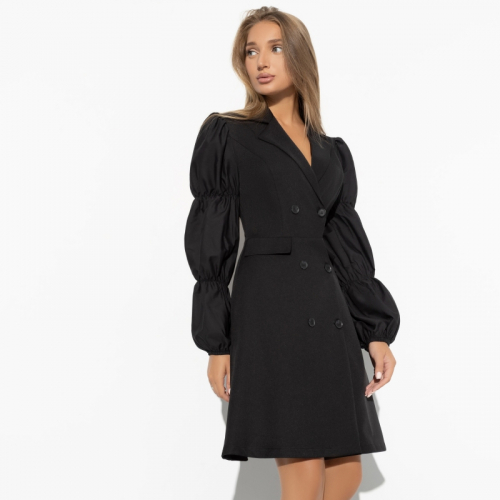 Готова ли ты к острым ощущениям ради любви? Тогда соглашайся сесть на его мотоцикл. Смотреться будете сногсшибательно. А он будет аккуратно везти такой подарок судьбы. Платье с лацканами в длине выше колена. Приталенный силуэт. Рукава оформлены резинками. Имитация карманов.