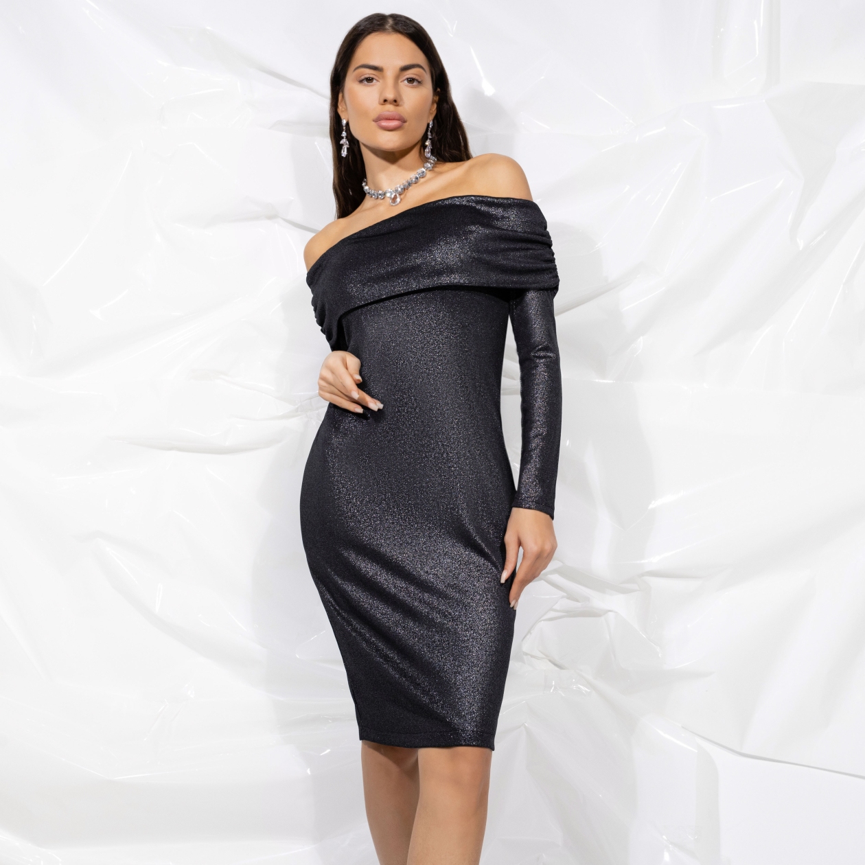 Ощутите себя в центре внимания с платьем «Модные грёзы», которое способно покорить любое торжество или вечернее мероприятие. Это вечернее платье женское выполнено из уникального трикотажа с металлизированным напылением, что придаёт ему роскошное мерцание и привлекает взгляды. Стильный приталенный силуэт подчеркивает грациозность фигуры, а открытая зона плеч со сборками добавляет образу нотку игривости и кокетливости. Оптовая покупка этих платьев станет удачным решением для магазинов одежды, стремящихся предложить своим клиентам эксклюзивные и трендовые модели.
