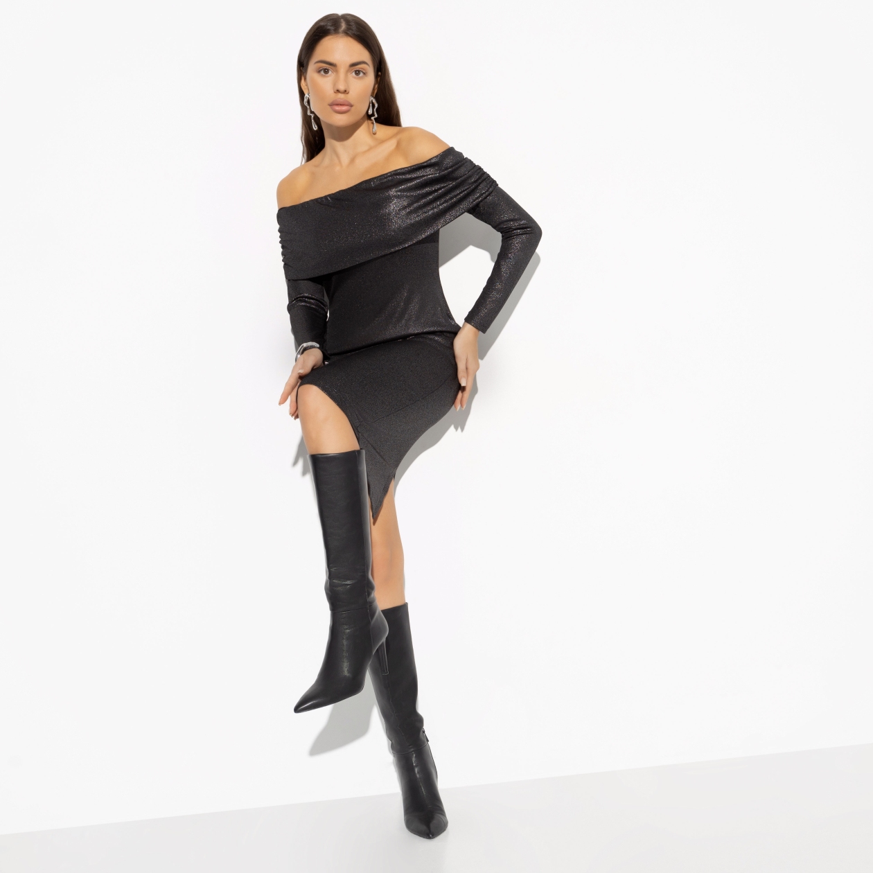 Чтобы быть железной леди не обязательно принимать сложные политические решения, достаточно выбрать платье CHARUTTI. Решительность, непреклонность и нежелание соглашаться на меньшее идут в комплекте. Платье приталенного силуэта в длине миди. Открытая зона плеч со сборками по бокам. Деликатный разрез по шву на спинке изделия. Платье без застежки из металлизированной ткани.