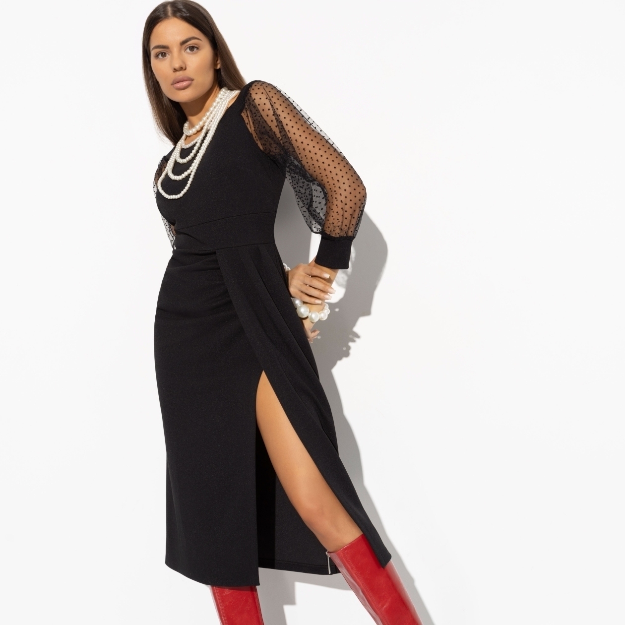Платье «Смотрите на меня» – это не просто вечернее платье женское, это настоящее произведение искусства, способное подчеркнуть вашу индивидуальность и создать неповторимый образ. Впечатляющий крой с высоким разрезом на запах придает платью особый шарм, делая его идеальным выбором для особых случаев. Приталенный силуэт и длина миди добавляют элегантности, а тонкое прозрачное кружево на рукавах привносит нотку романтичности. Это платье вечернее женское создано для тех, кто знает себе цену и готов восхищать окружающих. Оптом приобретая такие платья, вы обретаете не только стиль, но и уверенность в себе.