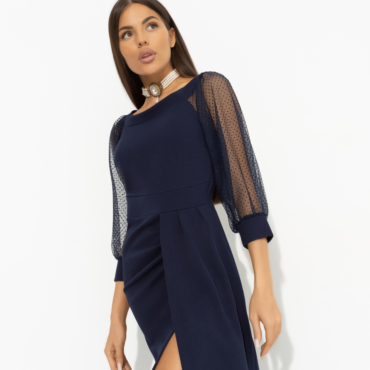 В платье CHARUTTI вы сходили на первое свидание с будущим мужем. Теперь оно навсегда наделено ореолом романтичности. Прекрасный повод доставать его на каждую годовщину, фасон никогда не выйдет из моды. Платье приталенного силуэта в длине миди. Есть глубокий разрез по передней части изделия. Рукава из акцентной сетки в мелкий горох. Платье без застежки.