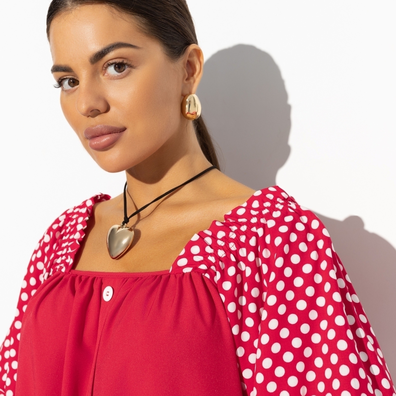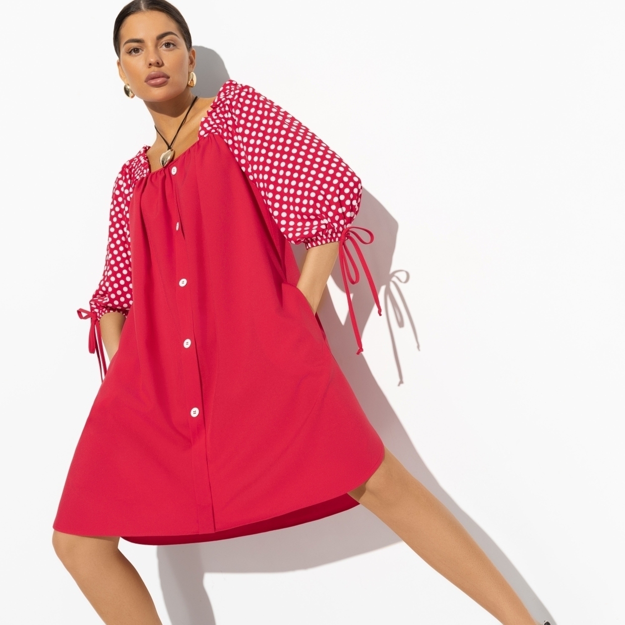 Роковая Софи Марсо обожала в своих нарядах две вещи – красный и горох. Платье CHARUTTI, словно воплощение идеальных образов из старого кино. Помните, что у вас главная роль в фильме под названием «Моя прекрасная жизнь». Платье свободного кроя. Квадратный вырез, рукава оформлены резинками. Положение линии плеч регулируется.
