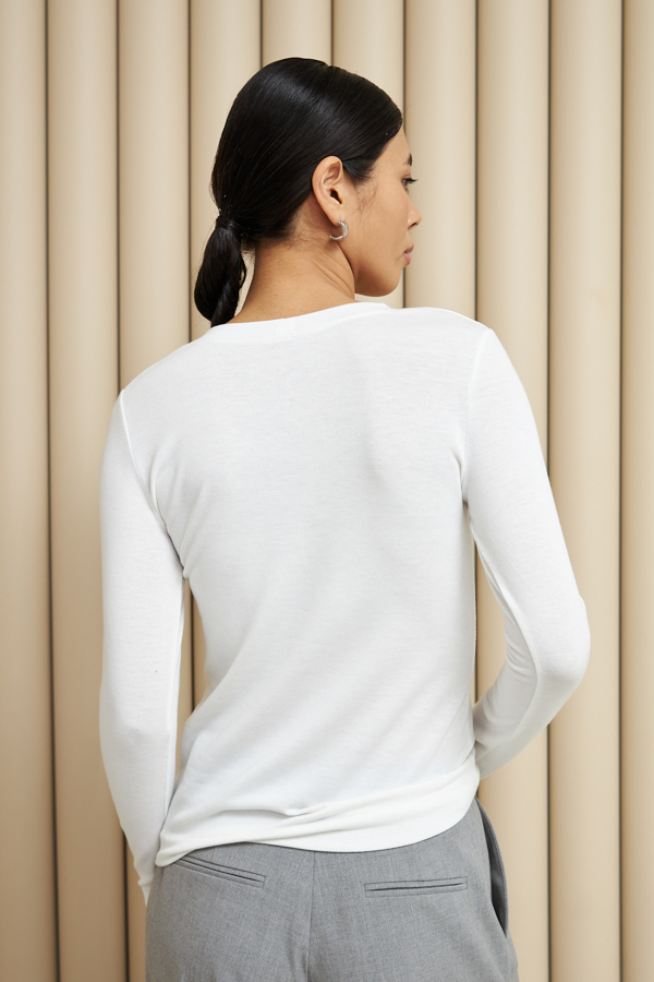 Джемпер прилегающего силуэта из эластичного полотна. Втачной длинный рукав. Круглый вырез горловины оформлен бейкой. Джемпер – это хорошая базовая вещь, подходящая для любого гардероба.