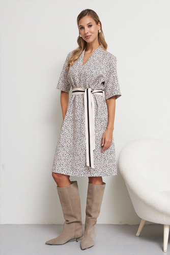 Платье из фактурного эластичного полотна с люрексом. Полуприлегающий силуэт, с разрезом в боковом шве. Цельнокроеный короткий рукав. Круглый вырез горловины окантован эластичной бейкой.