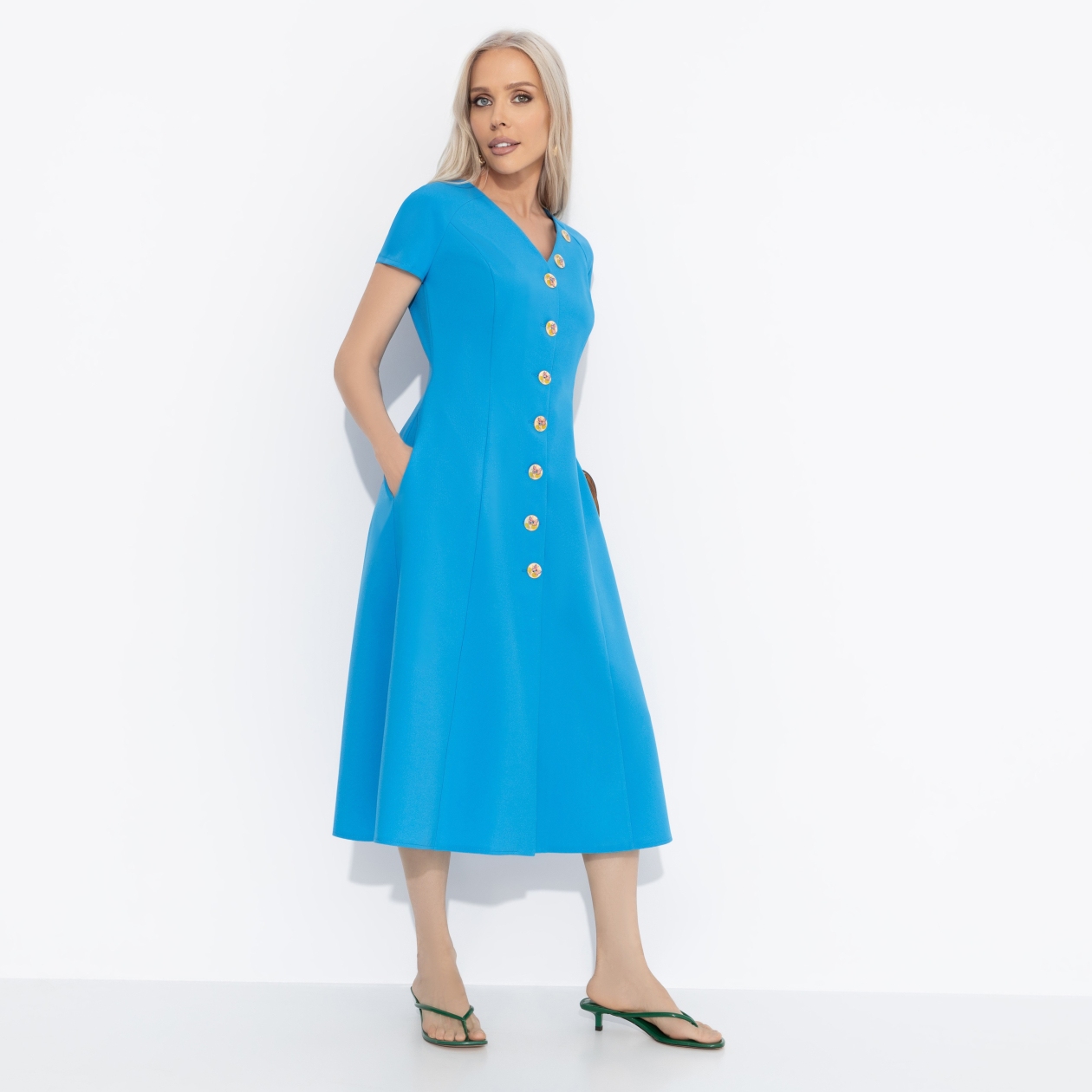 Платье CHARUTTI выглядит, как приглашение пойти на свидание. Женственное и элегантное, оно характеризует вас как порядочную и статную особу. Образ CHARUTTI, в который влюбляешься. Платье приталенного силуэта в длине миди. Акцентные пуговицы изделия. Есть деликатный разрез спереди по линии пуговиц. Платье с карманами.