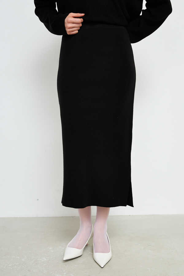 Юбка прилегающего силуэта с эластичным поясом и разрезом в боковом шве. Изделие выполнено из мягкой структурированной пряжи.