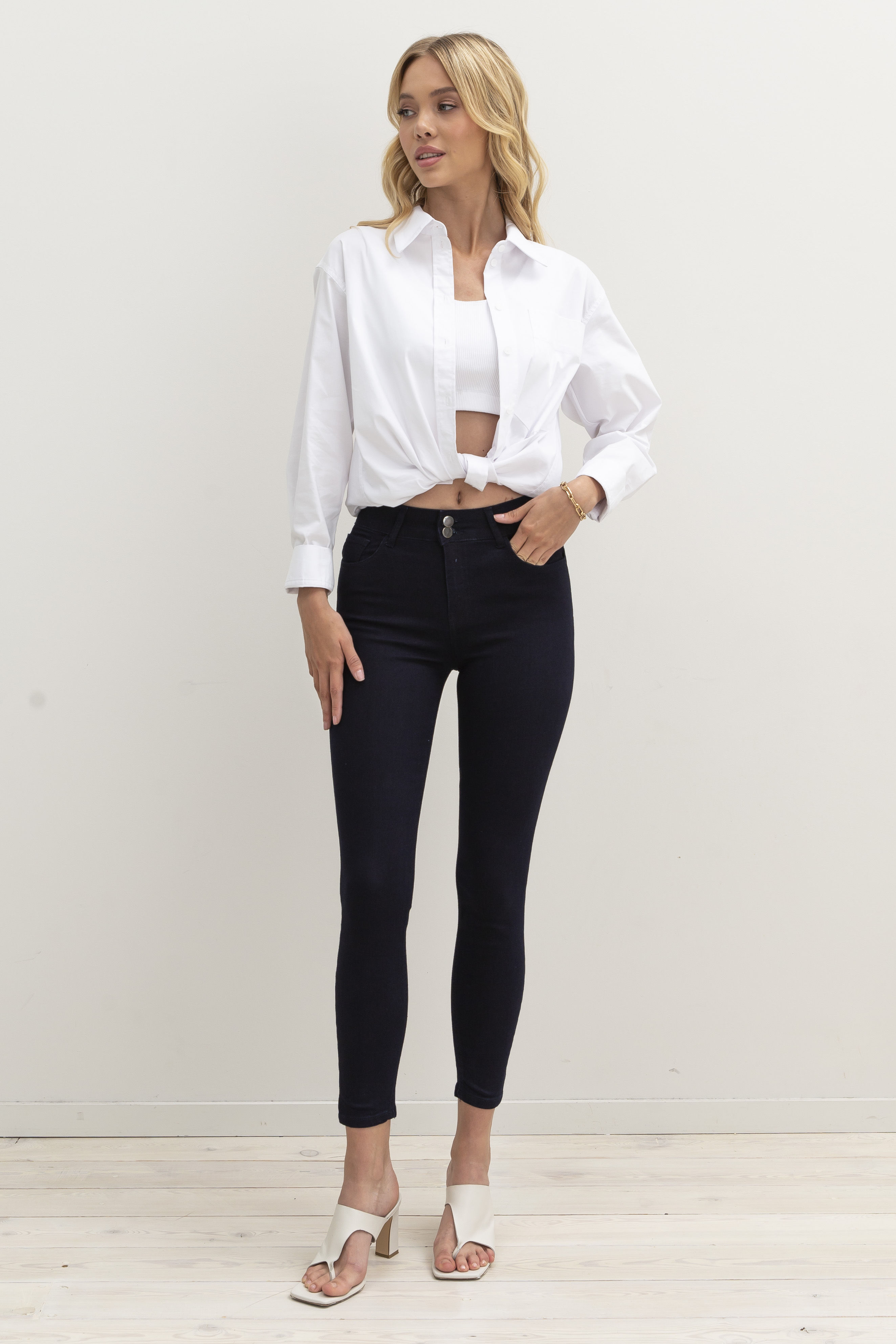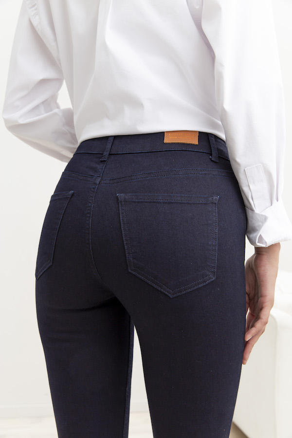 Брюки из эластичного денима, зауженные книзу выполнены по классической джинсовой технологии (варка с эффектом легкого выбеливания). На задней части брюк выполнены накладные карманы, на передней - карманы с подкройным бочком. Притачной пояс со шлёвками. Застёжка на молнию-гульфик и пуговицы.