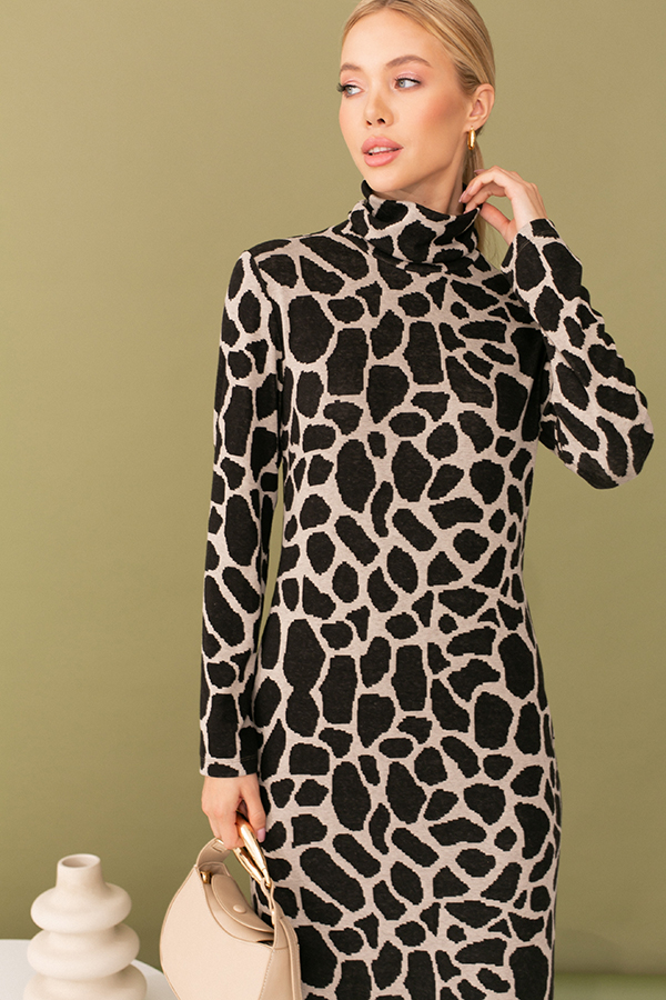 Платье полуприлегающего силуэта из эластичного полотна с жаккардовым анималистичным узором. Втачной длинный рукав. Воротник-стойка с отворотом.