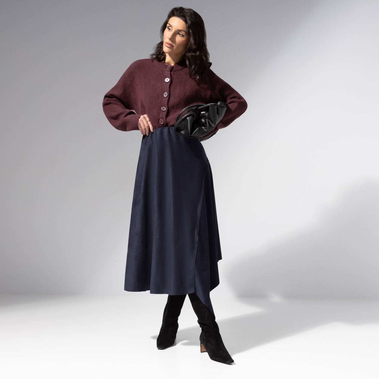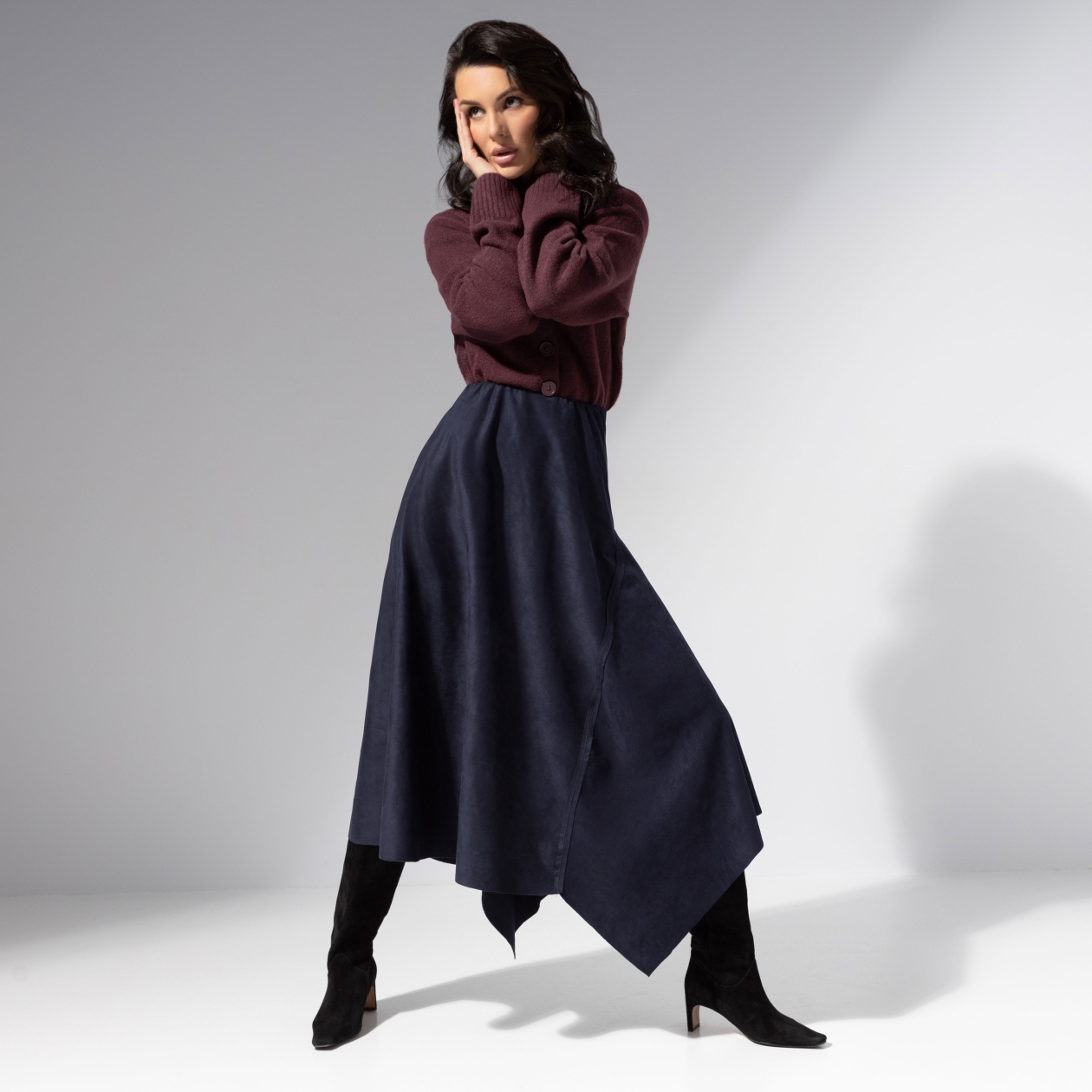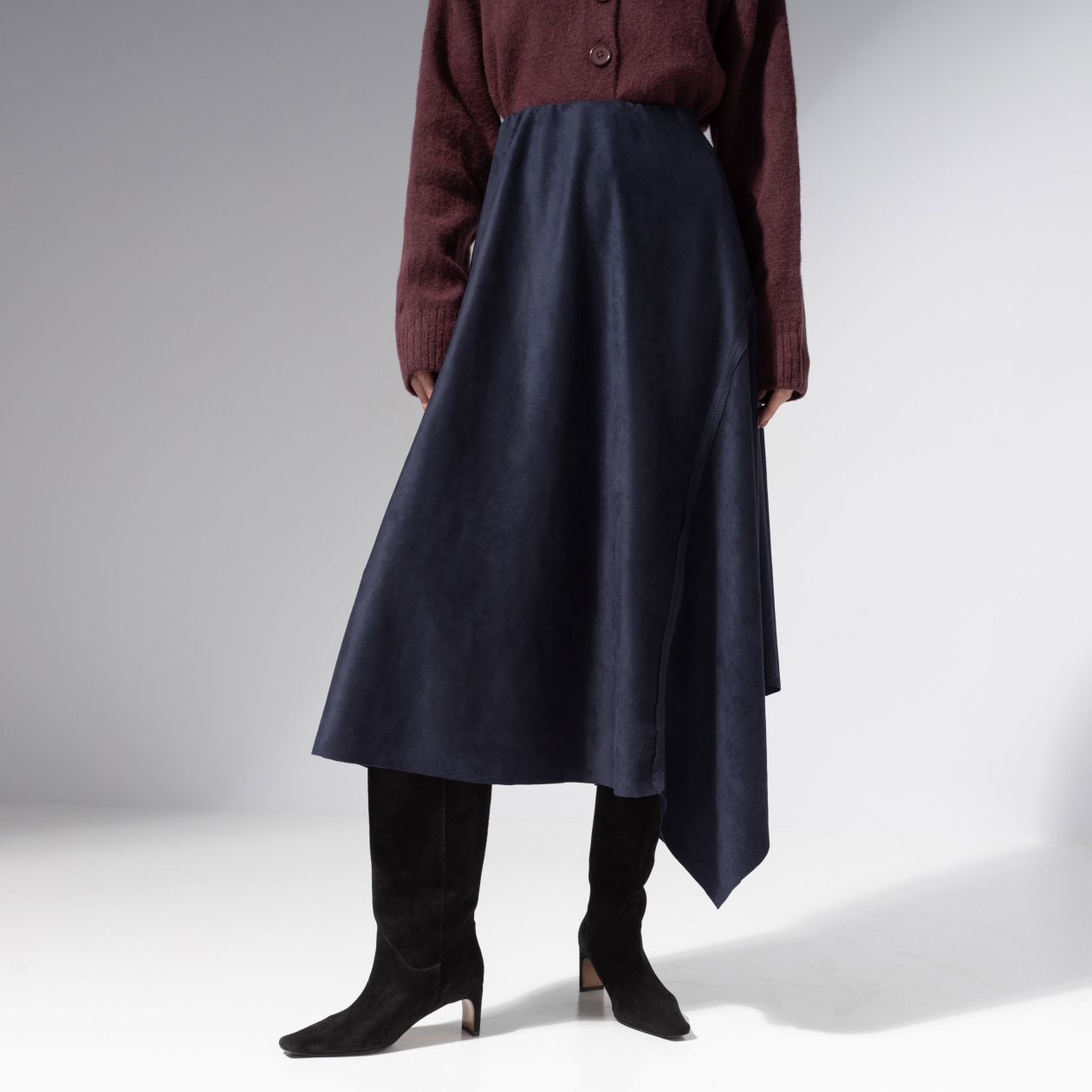 В ней есть всё, за что любят французский шик – легкость, женственность и намёк на интригу. Юбка ЧАРУТТИ в синем оттенке напоминает о вечерах в Париже, где уличные огни похожи на звёзды. Стройнит, вдохновляет, запоминается. Юбка асимметричного кроя из мягкой экозамши. Эластичный пояс на скрытой резинке. Материал приятный на ощупь, драпируется и сохраняет форму. Акцентные декоративные швы.