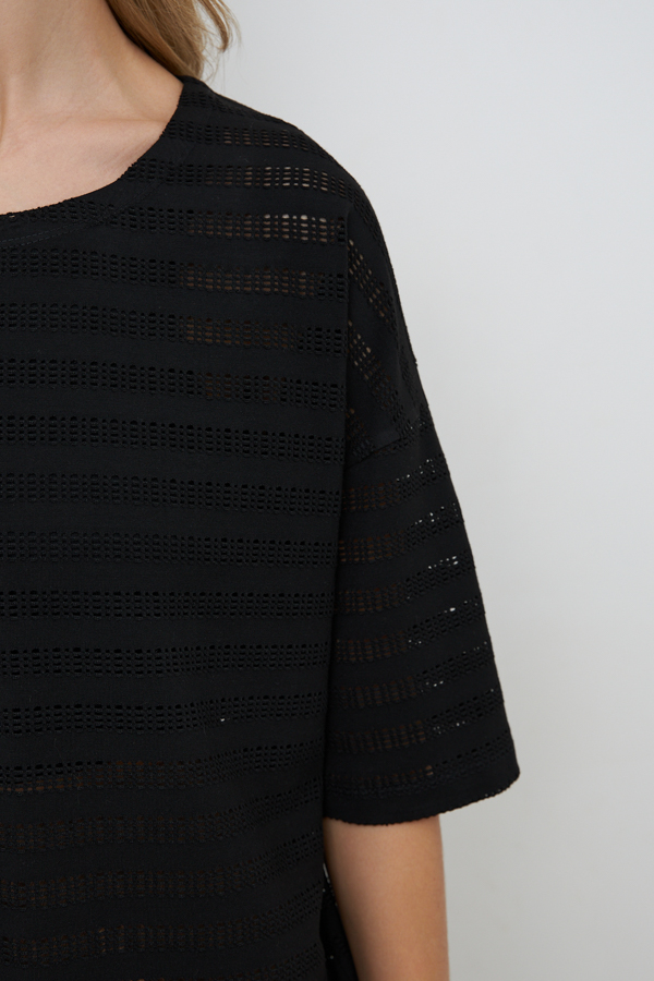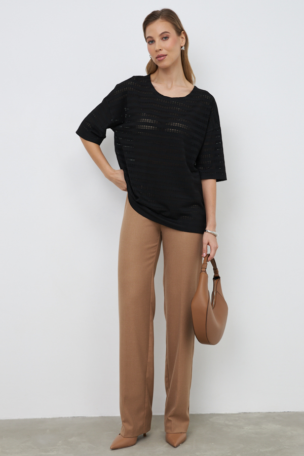 Джемпер свободного силуэта со спущенной линией плеча и рукавом до локтя выполнен из эластичного полотна. Круглый вырез горловины. В таблице размеров представлены параметры человека, а не изделия.