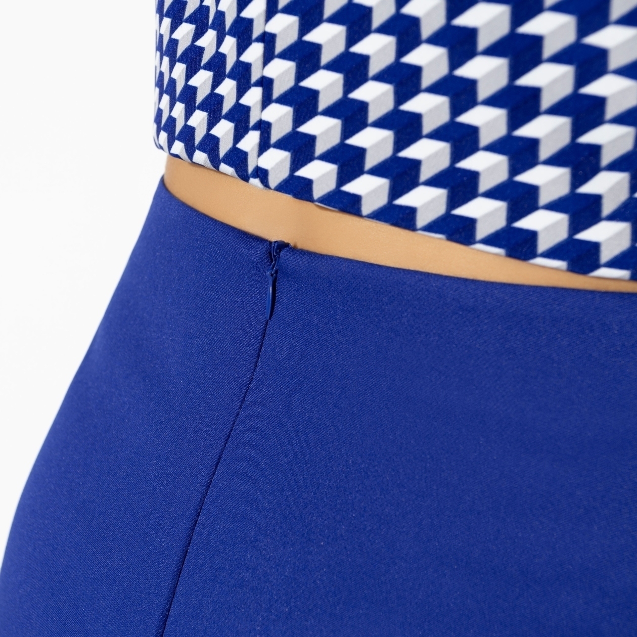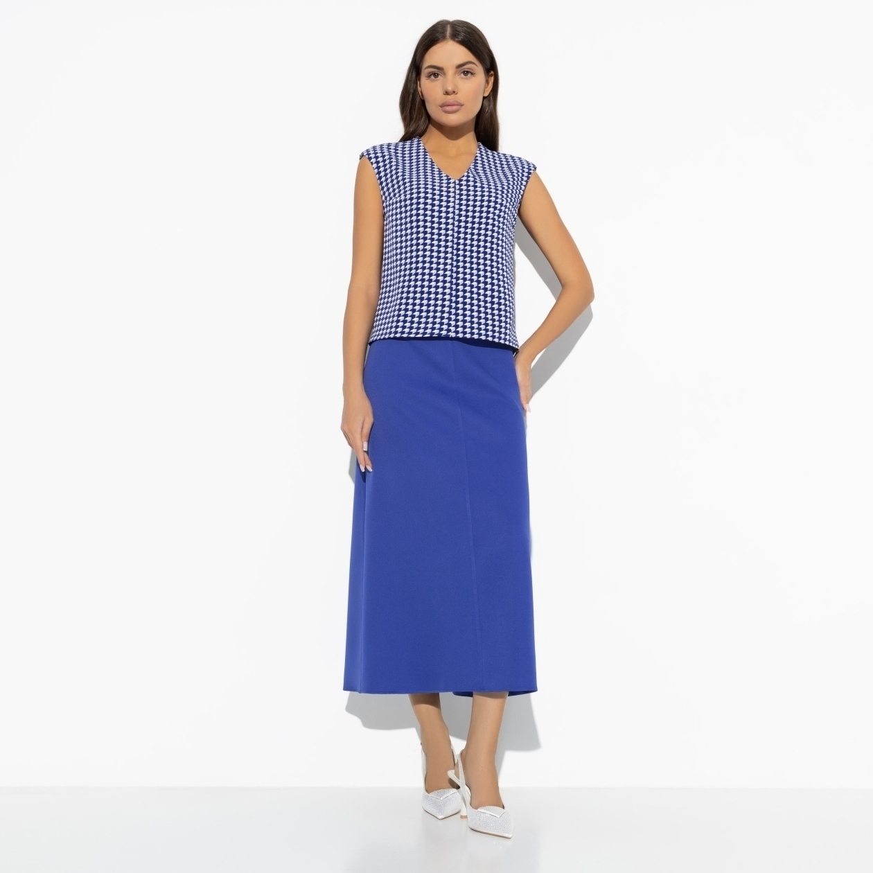Бывают дни, когда нужно выглядеть на высоте, а настроения подбирать комбинации нет. Именно для таких случаев дизайнеры CHARUTTI создали костюм с юбкой в яркой синей гамме. Все придумано за вас. Ваше дело – купить и надеть. В комплект входит топ без рукавов и юбка-трапеция в длине миди. Топ без застежки. Юбка имеет скрытую молнию по задней части изделия.