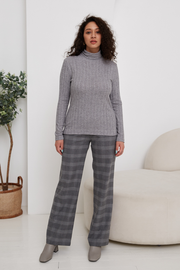 Брюки из клетчатой костюмной ткани, зауженные книзу. Притачной пояс с эластичной резиной. Секрет такой модели кроется в безупречно точной посадке по талии и бедрам – ничего лишнего, только конструктивные детали, которые придают четкость линиям силуэта.