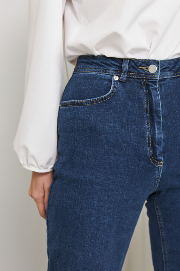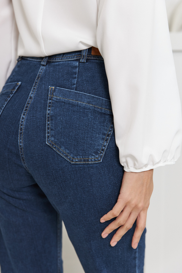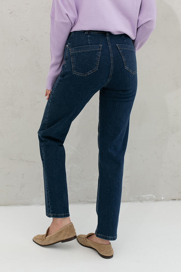 Брюки из эластичного денима, выполнены по классической джинсовой технологии (варка с эффектом легкого выбеливания). Крой классический прямой, слегка зауженный книзу. На задней части брюк выполнены накладные карманы, на передней- карманы с подкройным бочком. Притачной пояс со шлёвками. Застёжка на молнию-гульфик и пуговицу.