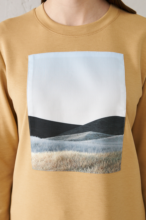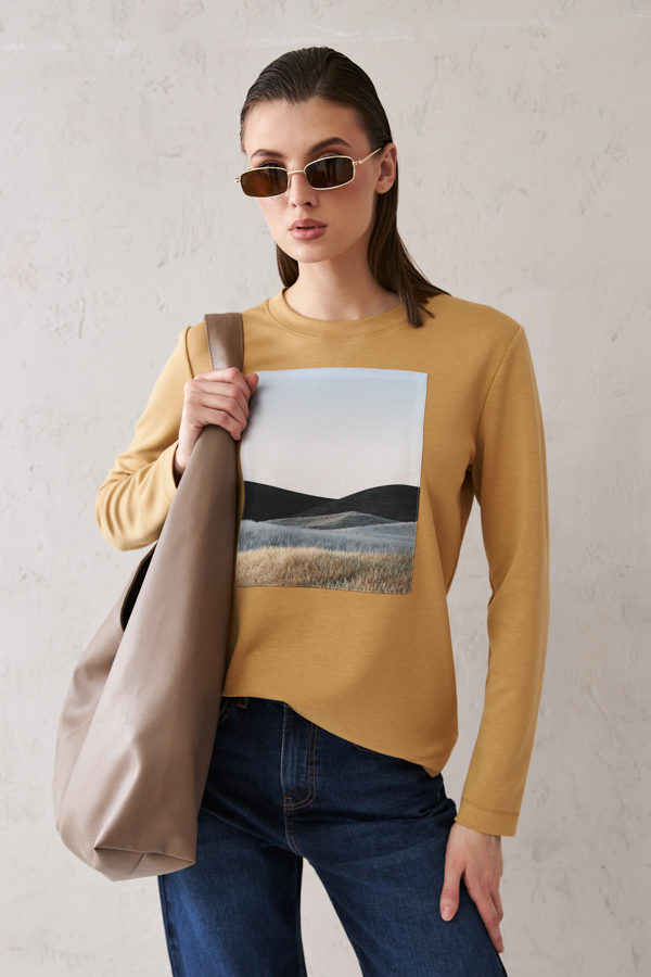 Джемпер свободного силуэта из эластичного полотна. Вырез горловины оформлен бейкой из основной ткани. На передней части изделия выполнена аппликация. Втачной длинный рукав.