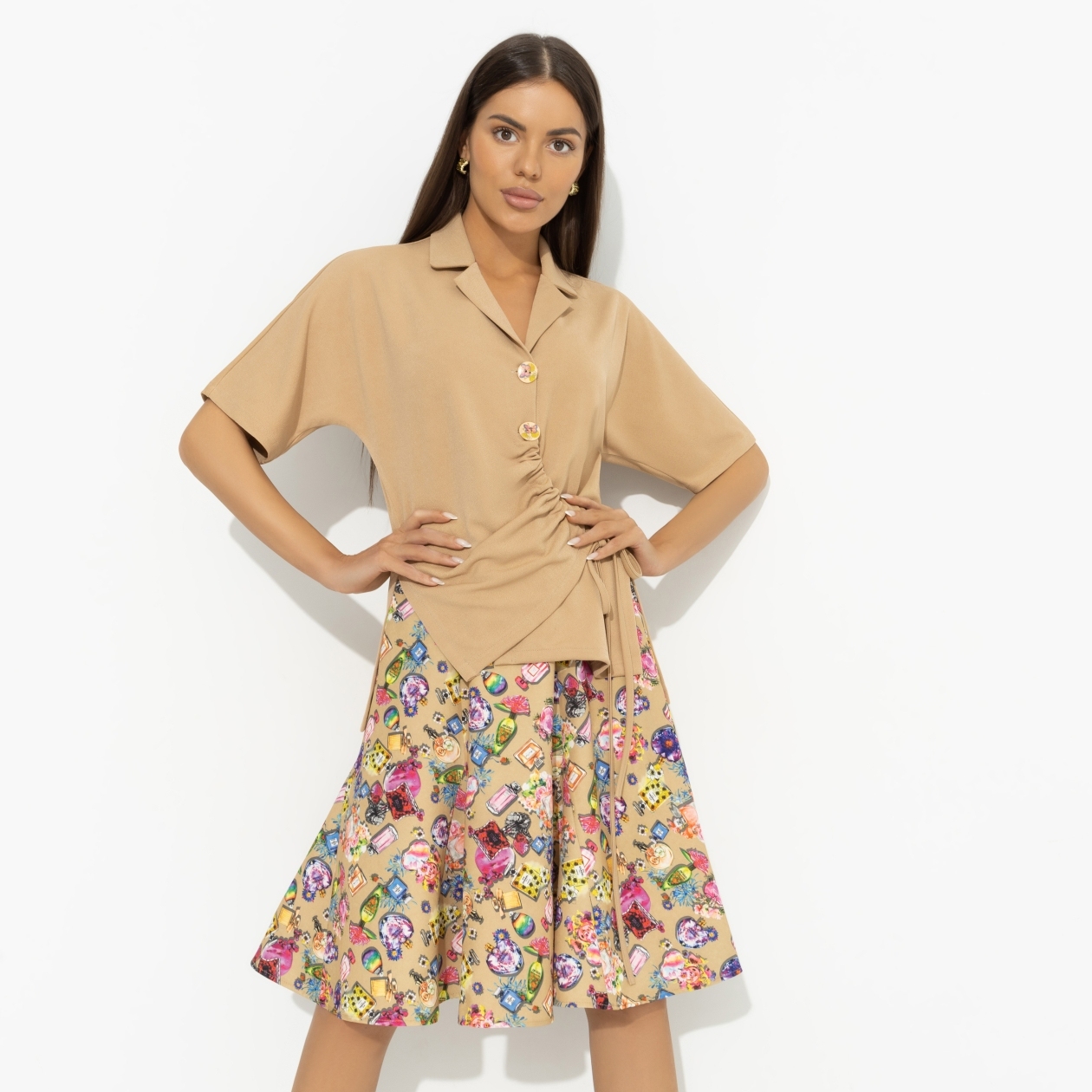 Недавно в столичном музее прошла первая в истории выставка, посвященная моде. Там были представлены культовые вещи, завоевавшие сердца модниц и звание произведения искусства. На экспозиции мог бы быть и костюм CHARUTTI, но увы, у нас не осталось экземпляров для выставки, все предназначены для вас. Комплект состоит из укороченного жакета ассиметричного кроя и расклешенной юбки. Пояс юбки на резинке. Жакет с лацканами. Есть разрезы по бокам изделия. Пуговицы жакета гармонируют с принтом юбки.