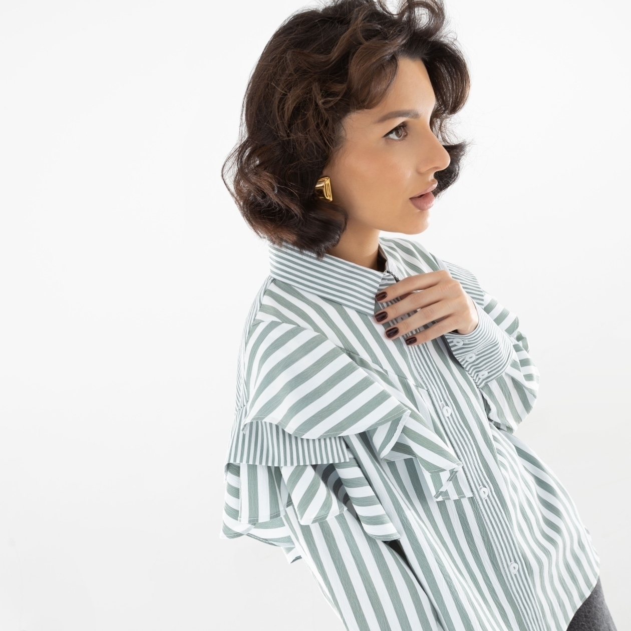 Взяв за основу классическую рубашку в полоску, дизайнеры CHARUTTI вывели её за пределы офисного стиля за счет объемного декора. Рюши делают образ слегка игривым, что не мешает стилизовать рубашку в casual луках. Рубашка свободного кроя. Объемный асимметричный декор с двух сторон изделия. Застегивается на пуговицы.