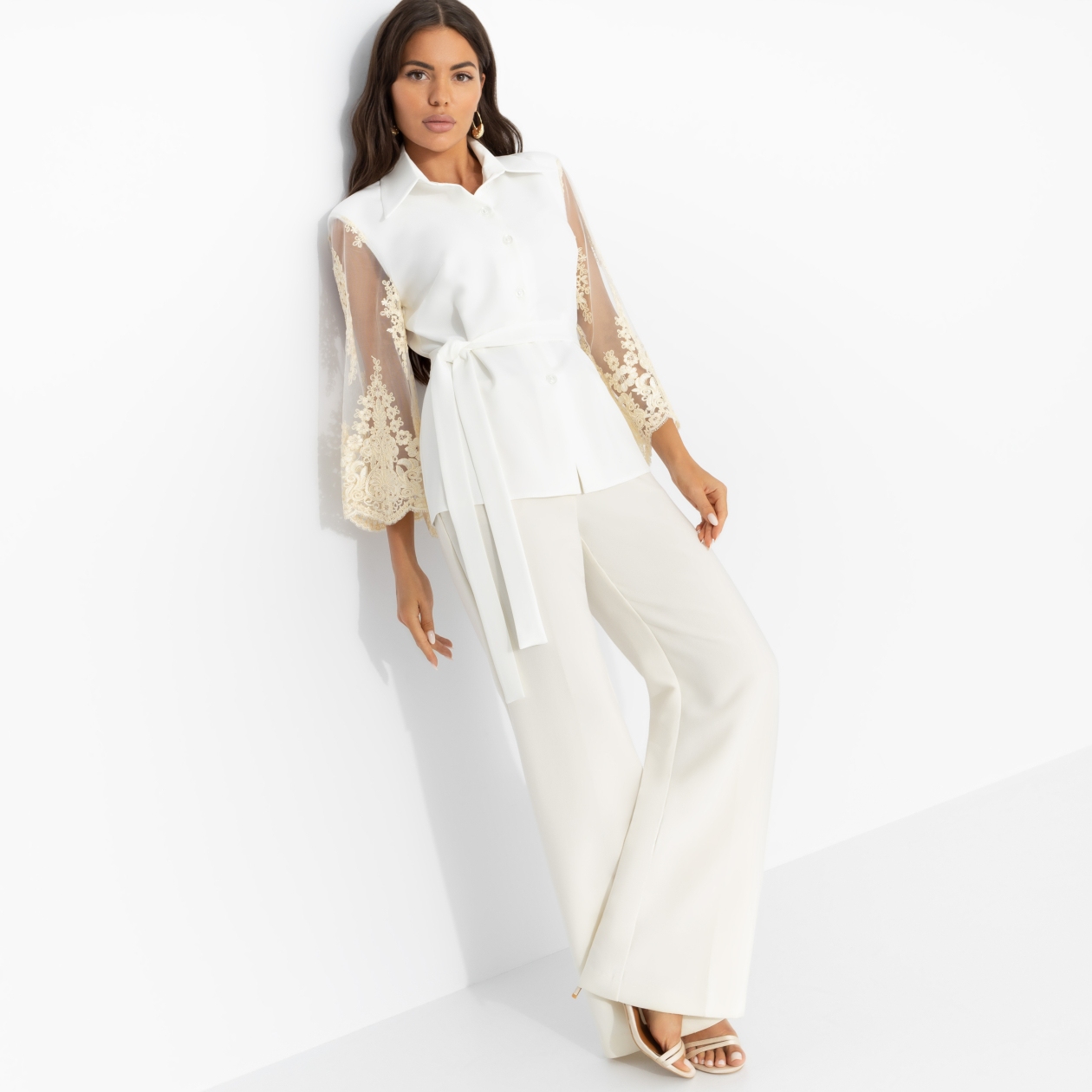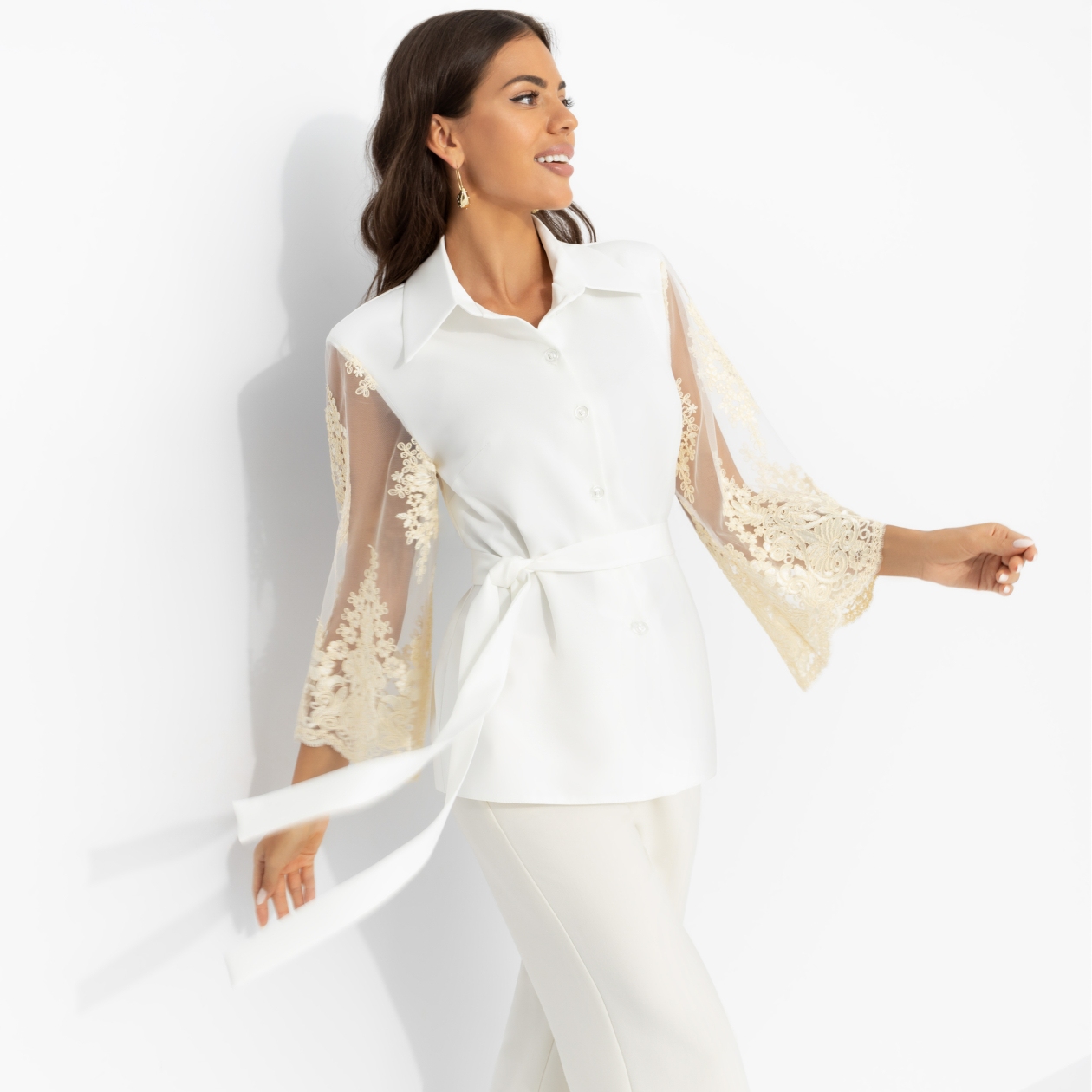 Она надела жакет ЧАРУТТИ в обычный четверг просто так. Еще не знала, что кружевные рукава станут крыльями для полета в счастливое будущее. Она потянулась за упавшей книгой в кафе и он тоже поспешил её поднять. Так они встретились. Она в жакете цвета айвори, он – готовый на все ради нее. Жакет комбинированный на подплечниках. Застегивается на пуговицы. Рукава из акцентного тонкого кружева, слегка укорочены. Есть пояс в тон изделия в комплекте.