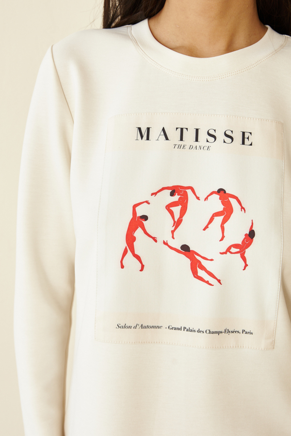 Джемпер свободного силуэта из эластичного полотна. Вырез горловины оформлен бейкой из основной ткани. На передней части изделия выполнена аппликация. Втачной длинный рукав.