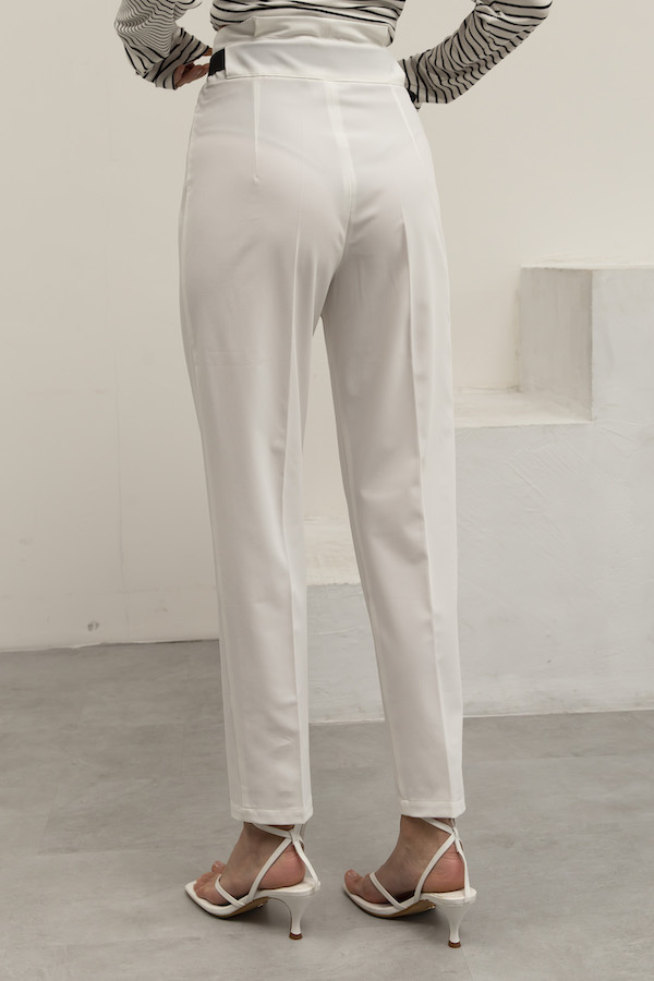 Актуальные брюки из полированной костюмной ткани, чуть зауженные книзу. Свободный силуэт с завышенной талией и подрезными карманами. Застёжка на молнию-гульфик. Линия талии подчёркнута защипами, эффектными шлёвками и контрастным поясом.