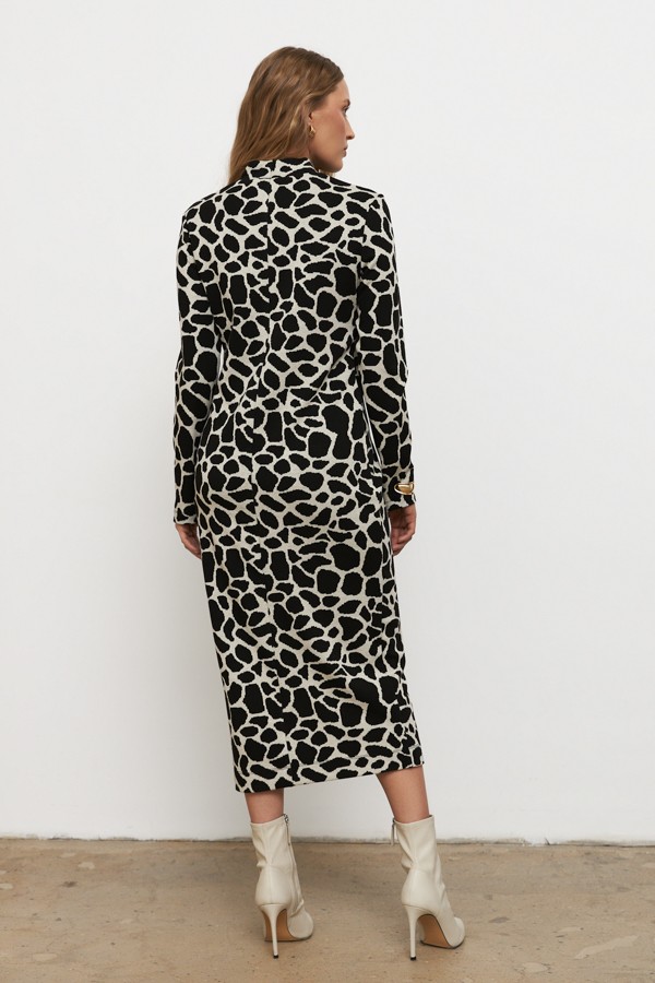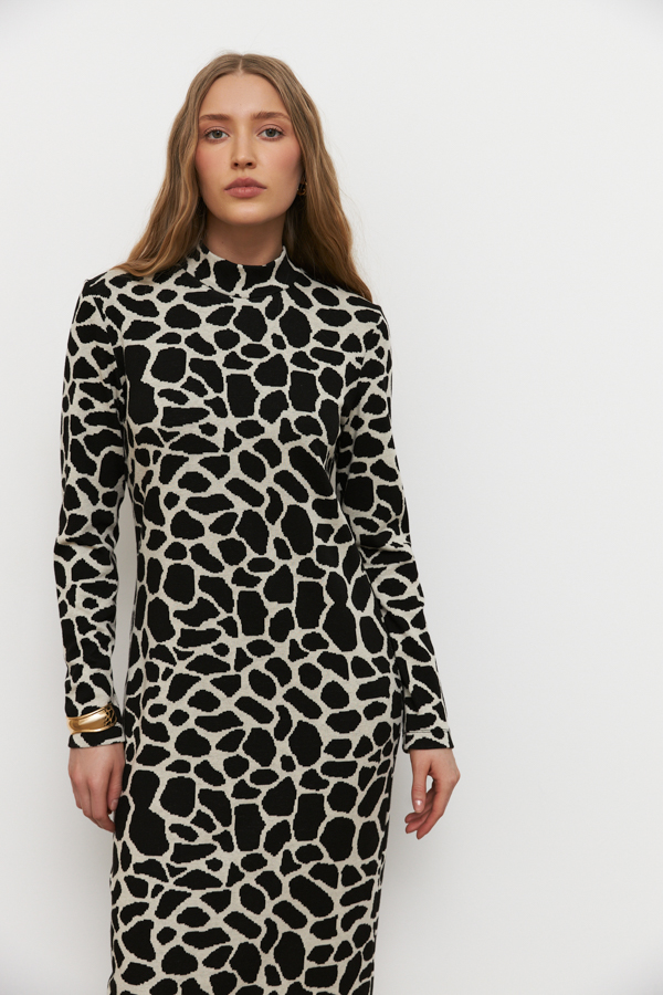 Платье полуприлегающего силуэта из эластичного полотна с жаккардовым узором. Вырез горловины оформлен воротником-стойкой. Втачной длинный рукав.