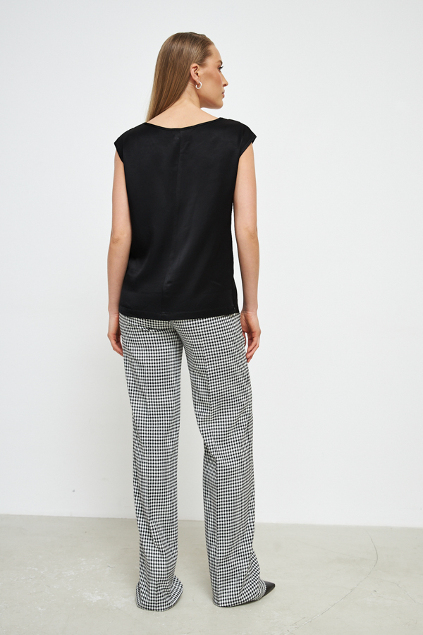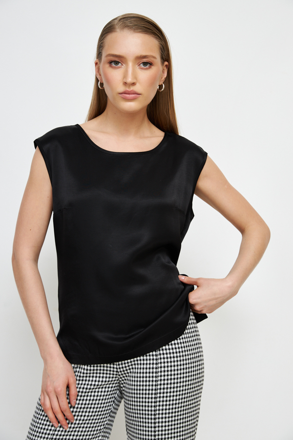 Топ из вискозной ткани с сатиновым блеском. Свободный силуэт, с небольшими разрезами в боковых швах. Круглый вырез горловины и линии проймы окантованы косыми бейками из основной ткани.