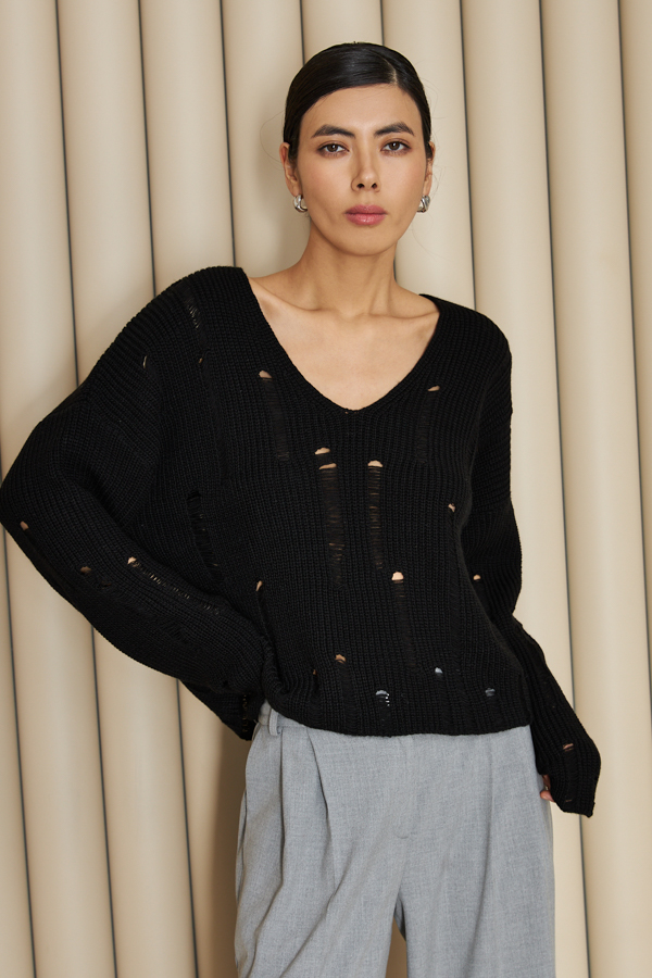 Оригинальный джемпер свободного силуэта с фактурой «жемчужный узор». Изделие со спущенной линией плеча и длинным рукавом. V-образный вырез горловины. Изделие выполнено из мягкой структуриванной пряжи.