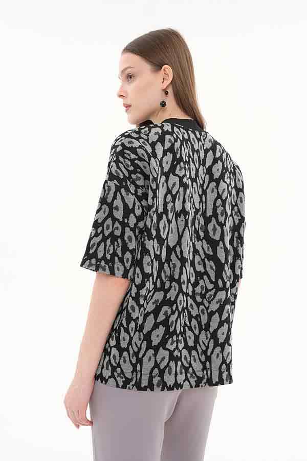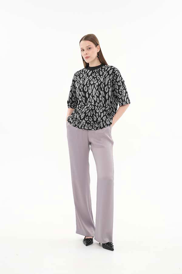 Джемпер свободного силуэта со спущенной линией плеча и рукавом до локтя выполнен из эластичного полотна. Вырез горловины оформлен подвязом. В таблице размеров представлены параметры человека, а не изделия.