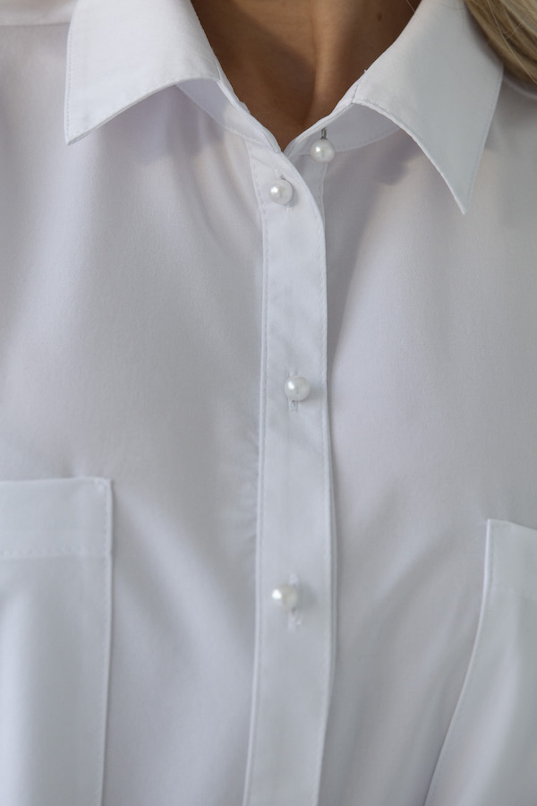 Модная блуза-туника из блузочной ткани очень свободного силуэта с застёжкой на планке. Низ изделия асимметричной длины (спинка удлинена относительно переда) с закруглениями по бокам. Рубашечный рукав ¾. Круглый вырез горловины обработан отложным воротником на стойке. На задней части изделия выполнена кокетка с небольшой бантовой складкой. На передней-накладные карманы в области груди. Жемчужные пуговицы на застёжке придают изделию нарядный вид. Достоинство этой модели - в способности скрыть некоторые недостатки фигуры. Её можно сочетать как с брюками, так и с джинсами.