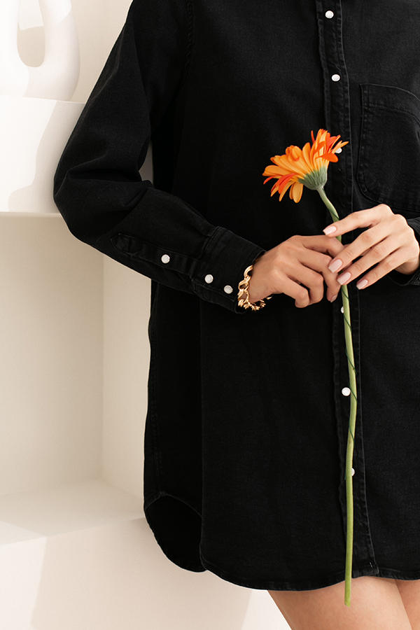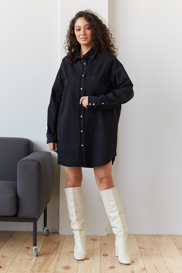 Платье-рубашка прямого свободного кроя из классического денима, выполнена по классической джинсовой технологии (варка с эффектом легкого выбеливания). Рубашечный воротник, накладной карман, застежка на кнопки с керамическим декором. Рукав втачной с манжетой. Швы оформлены декоративными строчками. Длина изделия позволяет его носить как самостятельное платье, так и в комплекте с брюками. Изделие очень свободного кроя. Любителя более плотной посадки рекомендуем брать на размер меньше.