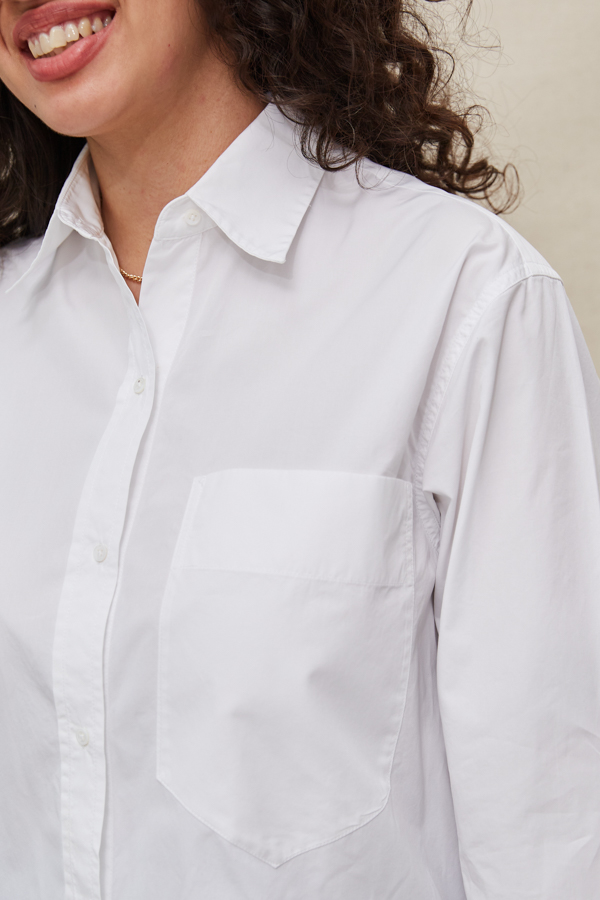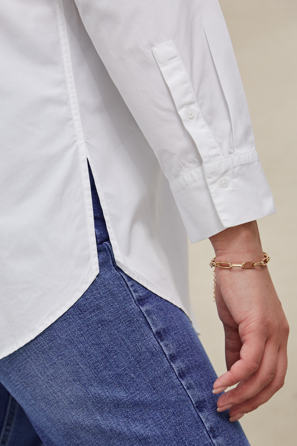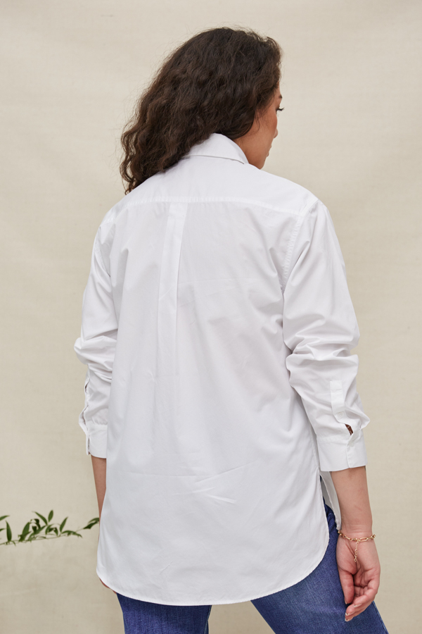 Рубашка из хлопковой ткани свободного силуэта с застёжкой на планке. Низ изделия с закруглениями по бокам и разрезами. Рубашечный рукав на манжете с застёжкой на пуговицы. Вырез горловины обработан отложным воротником на стойке. На задней части изделия выполнена кокетка с небольшой складкой. На передней-накладной карман в области груди. Достоинство этой модели в способности скрыть некоторые недостатки фигуры. Её можно сочетать как с брюками, так и с джинсами.