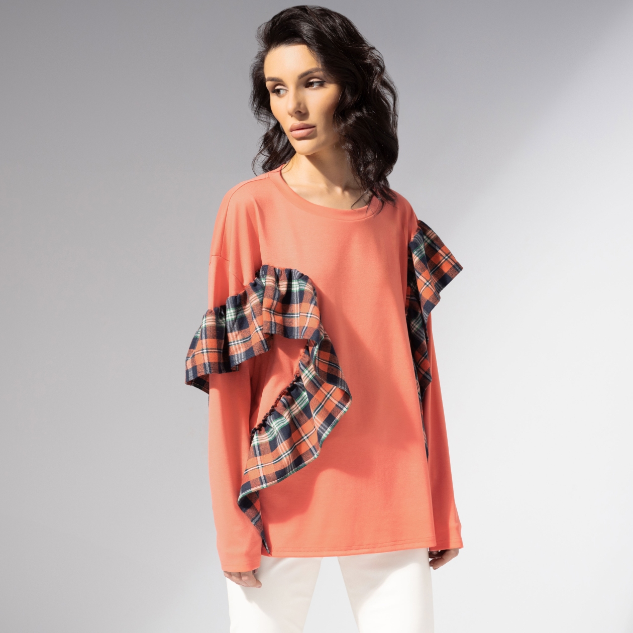 Лососевый оттенок – фаворит сезона, сочетающий мягкость и статус. Лонгслив ЧАРУТТИ создаёт настроение уверенной женственности, будто говорит: «Я выбираю комфорт и стиль, без компромиссов». Комфортный лонгслив из эластичного трикотажа антипилинг и клетчатой фланели. Воланы по рукавам добавляют динамику образу. Свободный крой, круглый вырез. Трикотаж пластичный, лёгкий в уходе.