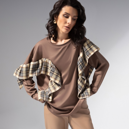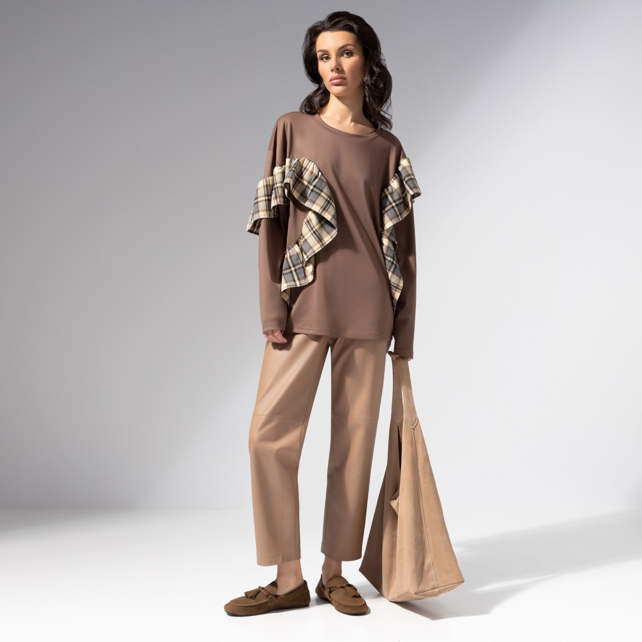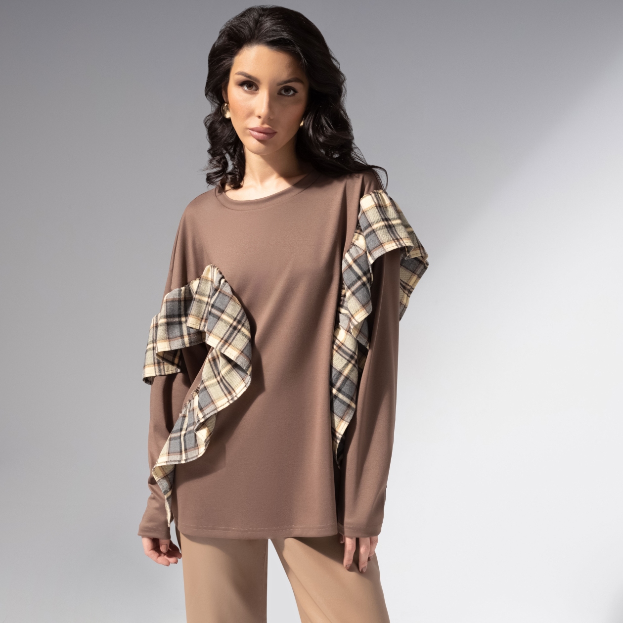 Магия – в деталях. Лонгслив ЧАРУТТИ превращает casual в искусство благодаря воланам из мягкой фланели и глубине оттенка молочного шоколада. Стиль, вдохновлённый подиумами London Fashion Week, где клетка вновь стала символом интеллигентной дерзости. Трикотаж антипилинг, приятный к телу, с матовой поверхностью. Вставки из фланели в клетку по рукавам. Свободный силуэт, мягкие манжеты, округлый вырез.