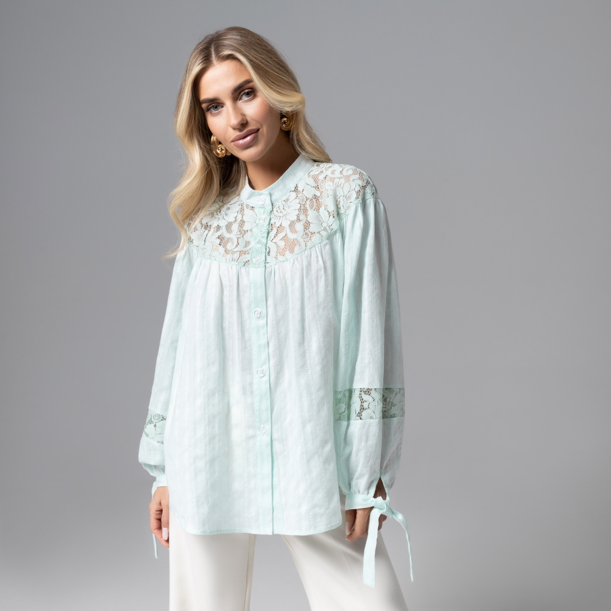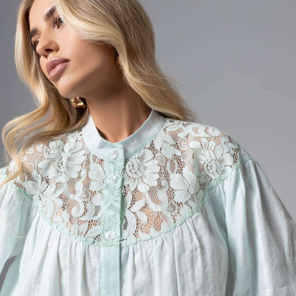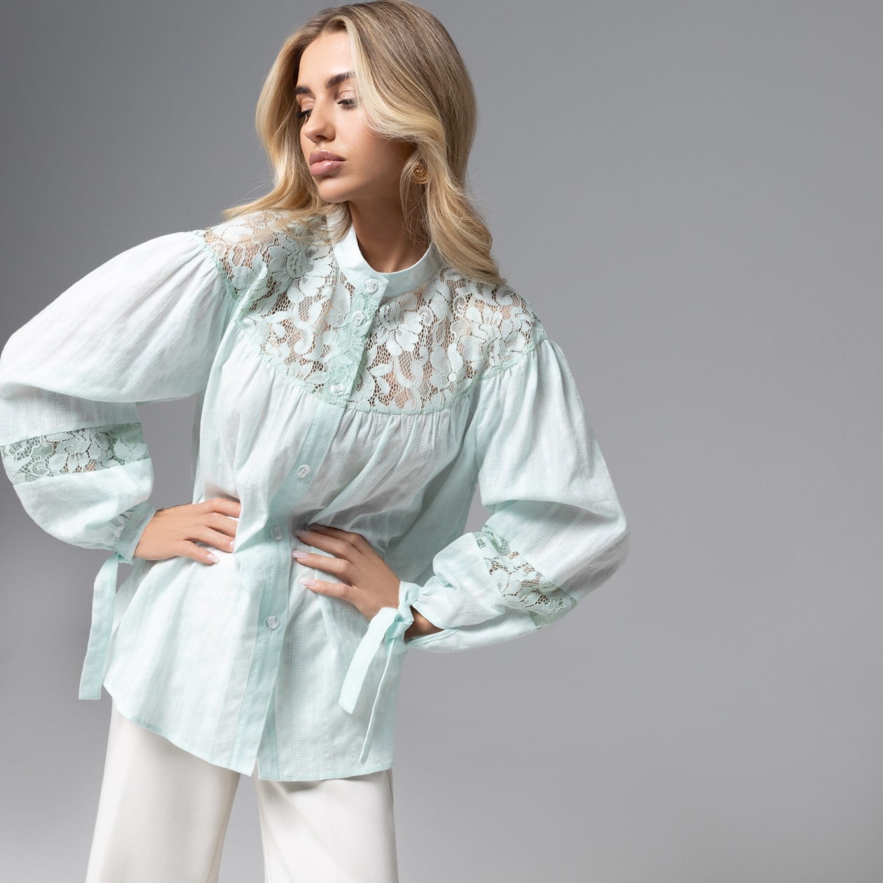 Стиль бохо появился в 60-ых. Тогда любители свободного самовыражения задавали тренд. Потом мода переживала разные этапы и, наконец, возвращает нас к духу независимости. Свобода в движении – свобода в жизни. Блуза в нежном бирюзовом цвете создана, чтобы вы дышали полной грудью. Блуза свободного кроя из 100% хлопка. Акцентные вставки из тончайшего кружева премиального качества. Воротник-стойка. Завязки на манжетах.