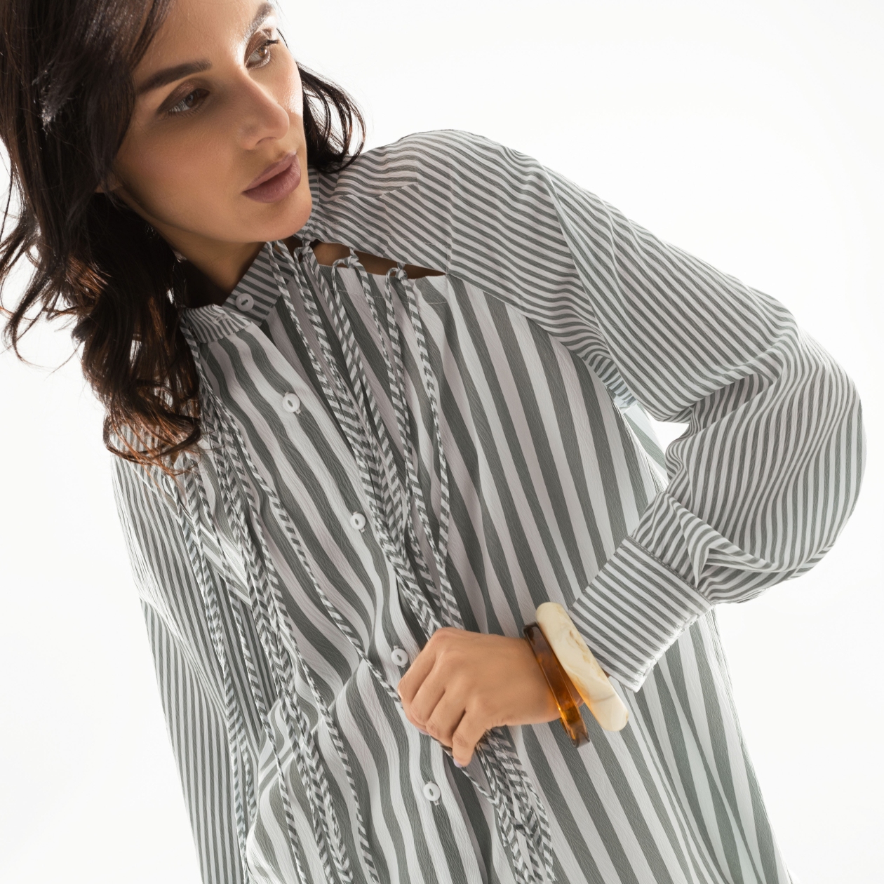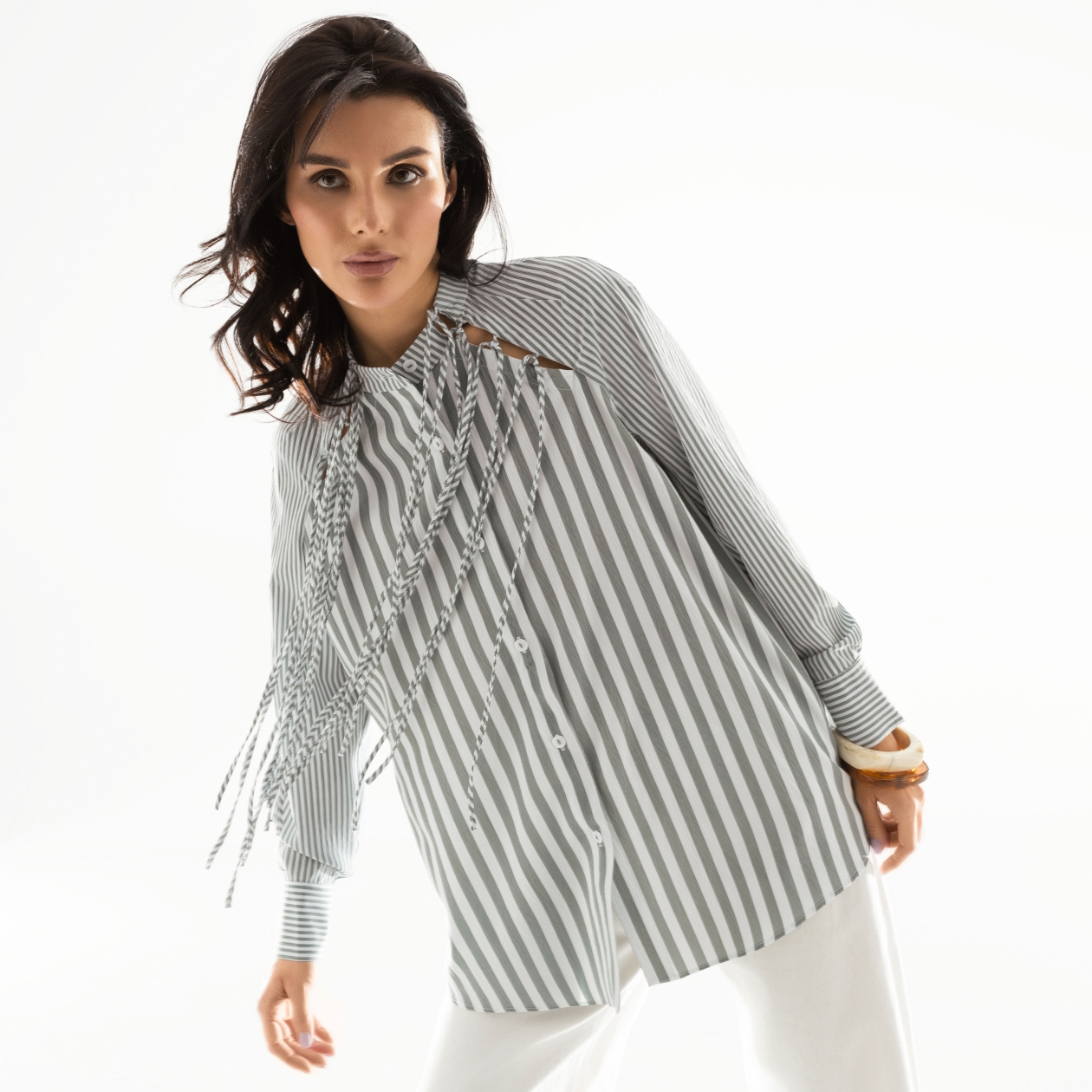 Модная экспертиза подтверждает: вы – на острие трендов. Ненавязчивая полоска, разрезы, бахрома и необычный крой рубашки повысят градус стиля любого вашего образа до 100%. Эффектный officecore в интерпретации CHARUTTI.