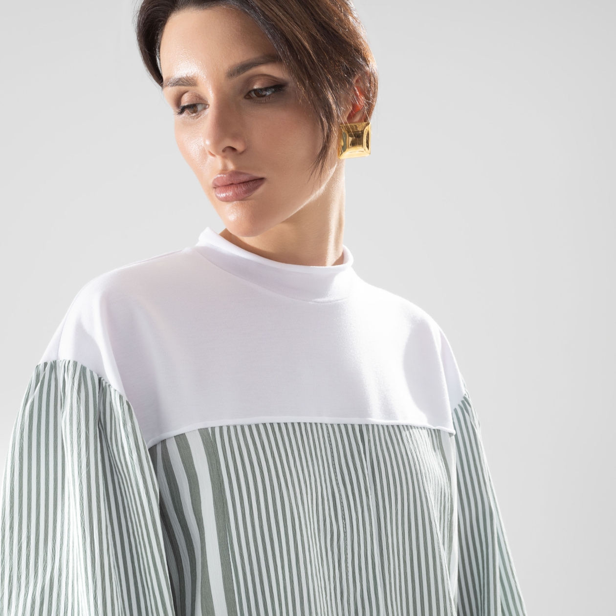 Свитшот комбинированный «Мягкая сила (new)» — это не просто женская одежда, это воплощение стиля и комфорта, идеальное решение для тех, кто ценит качество и элегантность. Изготовленный из трикотажного футера и рубашечной поливискозы, этот свитшот женский оверсайз превращает каждый ваш день в праздник. Его свободный крой и спущенная линия рукава обещают не только свободу движения, но и стильный силуэт, который станет основой вашего гардероба. Покупая свитшоты женские оптом, вы выбираете не только моду, но и уверенность в каждой детали.