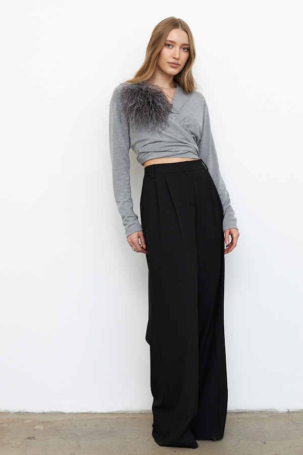Джемпер свободного силуэта из меланжевого эластичного полотна. На детали полочки цельнокроеные длинные завязки. Вырез глубокий, V-образный. Втачной рукав в спущенную пройму. Длина джемпера до линии талии.