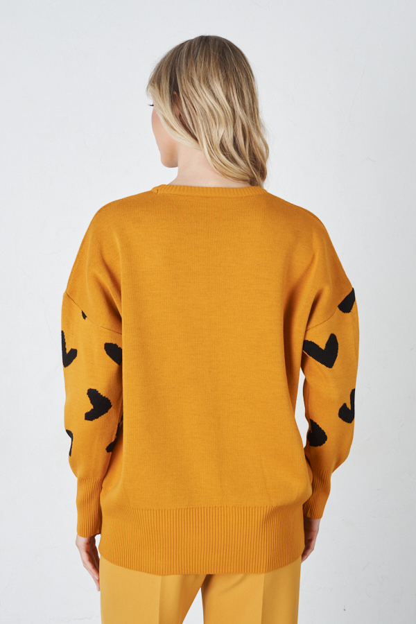 Джемпер свободного силуэта с узором «сердечки» на передней части. Изделие со спущенной линией плеча и длинным рукавом. Низ изделия и низ рукава с высокой резинкой. Круглый вырез горловины оформлен резинкой-бейкой. Изделие выполнено из мягкой структурированной пряжи.