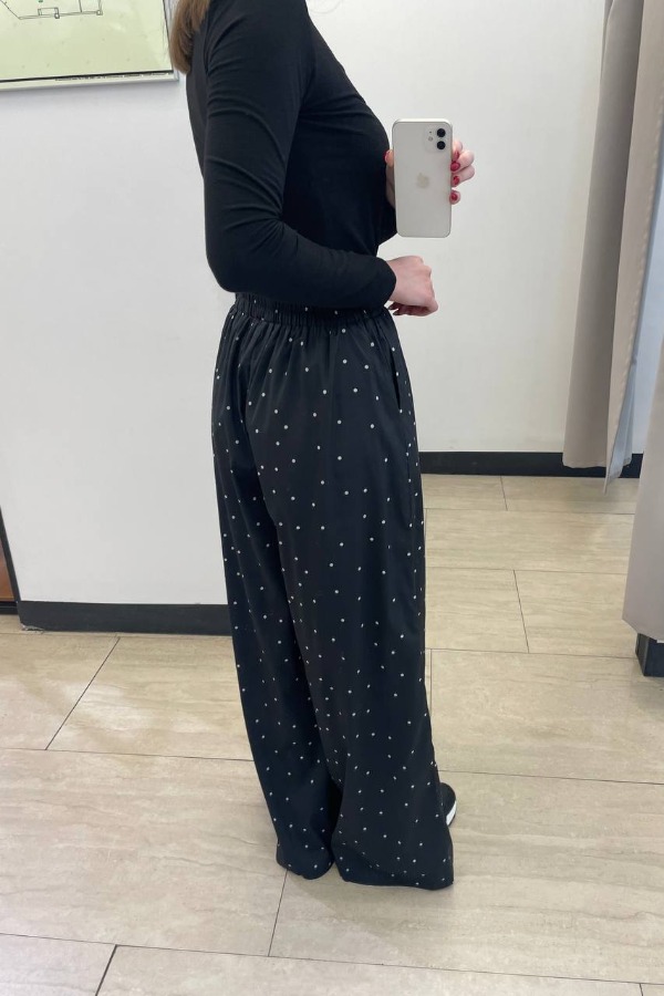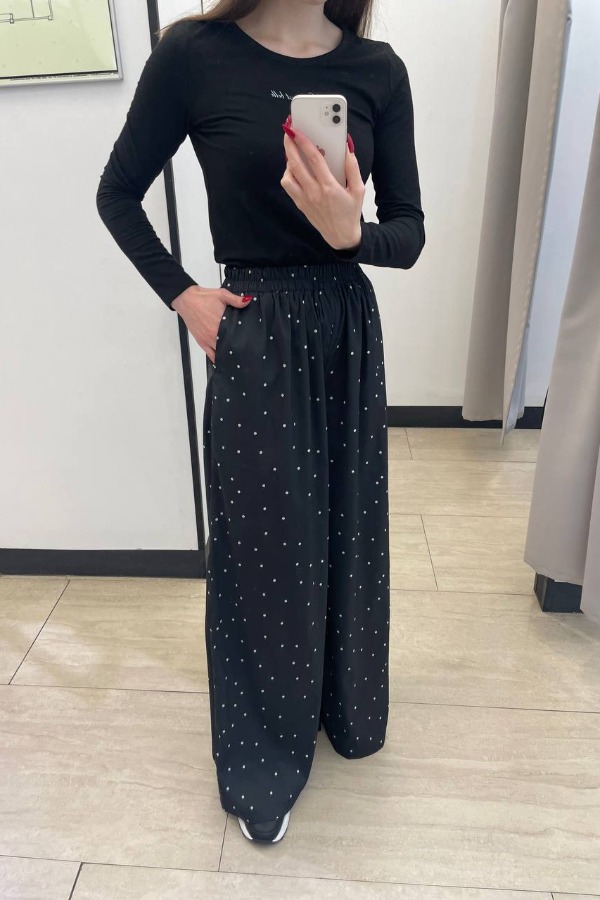 Брюки прямого свободного силуэта из вискозной ткани. Пояс притачной с эластичной резиной, в боковых швах карманы.