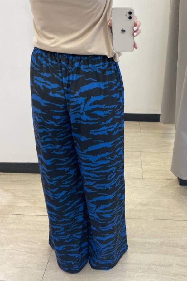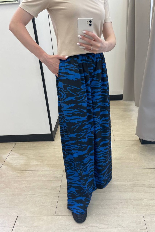 Брюки прямого свободного силуэта из вискозной ткани. Пояс притачной с эластичной резиной, в боковых швах карманы.