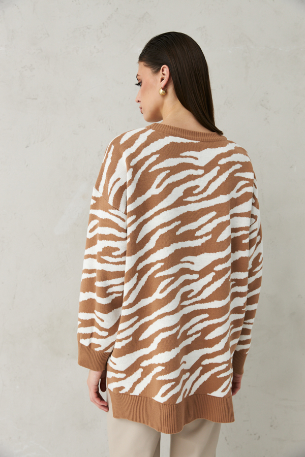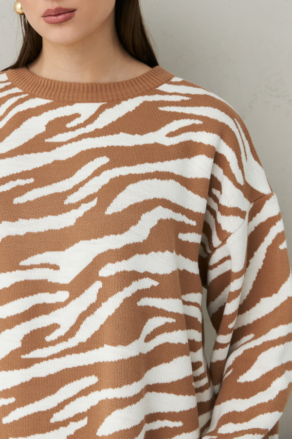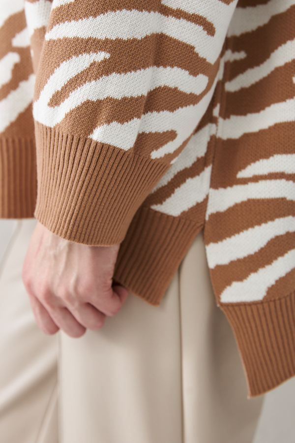 Джемпер очень свободного силуэта со спущенной линией плеча и длинным рукавом. Низ изделия асимметричной длины (спинка удлинена относительно переда) с разрезами по бокам. Круглый вырез горловины, низ изделия и низ рукава оформлены резинкой. Изделие выполнено из мягкой структурированной пряжи.